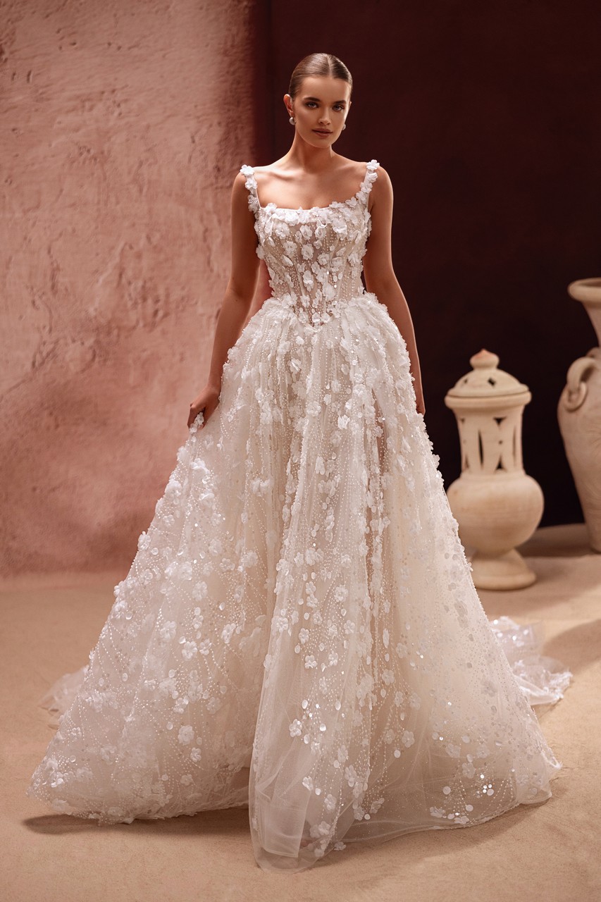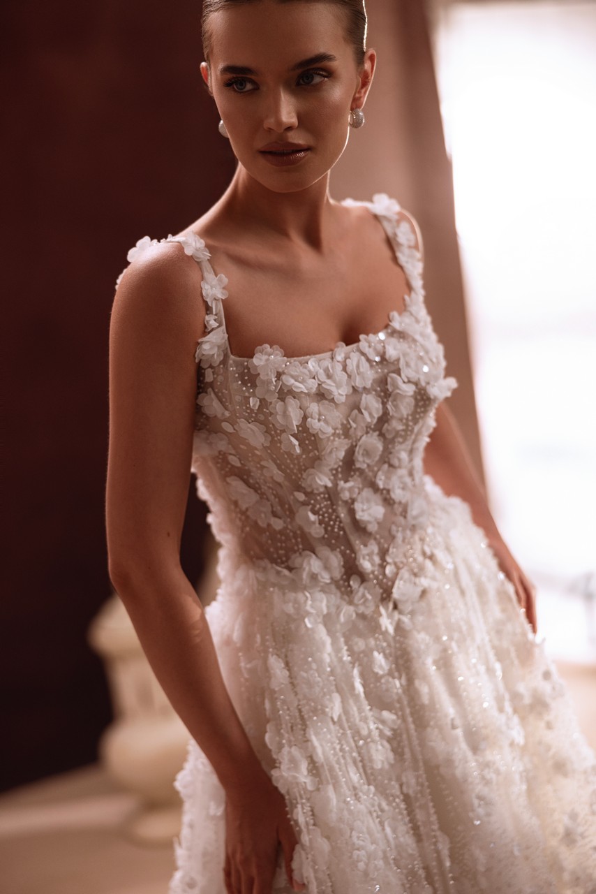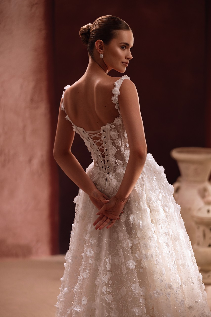 Το Cintra είναι ένα φόρεμα φτιαγμένο για νύφες που ονειρεύονται να περπατήσουν στον διάδρομο με κάτι αξέχαστο. Το φόρεμα διαθέτει εφαρμοστό μπούστο από κορσέ με λεπτές τιράντες, πλούσια διακοσμημένο με τρισδιάστατες φλοράλ απλικέ που καταλήγουν άψογα στην πλήρη φούστα. Κάθε λεπτομέρεια αιχμαλωτίζει το φως όμορφα, δίνοντας στο φόρεμα μια αίσθηση βάθους και κίνησης. Η σιλουέτα σε γραμμή Α εξισορροπεί τη δομή και την απαλότητα, αναδεικνύοντας τη μέση, προσφέροντας παράλληλα ελευθερία και άνεση. Τα φλοράλ διακοσμητικά, σε συνδυασμό με τη διακριτική λάμψη, δημιουργούν ένα πραγματικά ρομαντικό εφέ, ενώ η πλάτη με κορδόνια προσθέτει μια πινελιά παράδοσης και εξασφαλίζει τέλεια εφαρμογή. Το Cintra είναι το είδος του φορέματος που μετατρέπει κάθε βήμα σε μια δήλωση και κάνει τη νύφη το απόλυτο κεντρικό κομμάτι της ημέρας της.