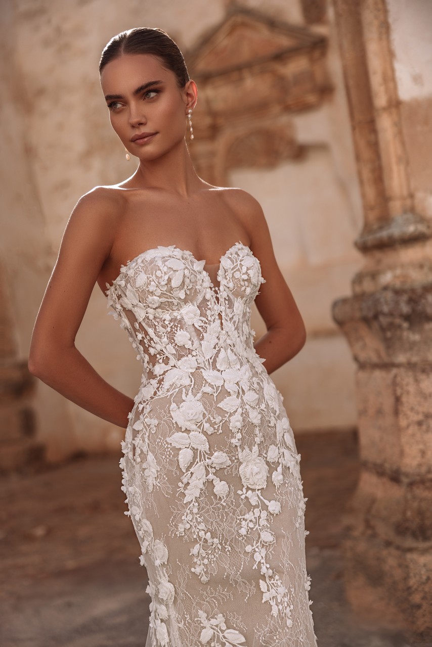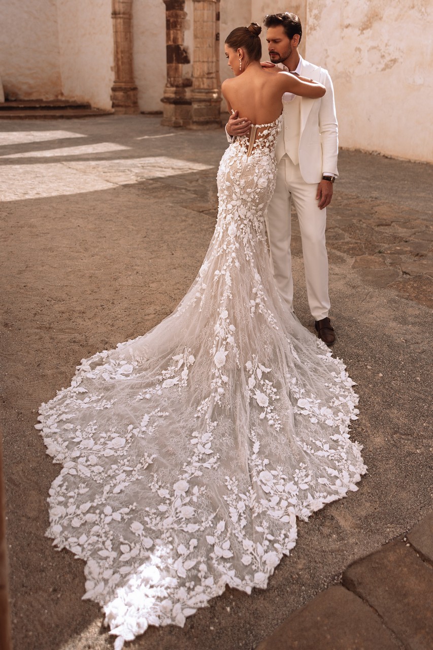 Το φόρεμα Sarifa είναι για τη νύφη που θέλει να νιώσει πραγματικά αξέχαστη. Αυτή η σιλουέτα γοργόνας χωρίς τιράντες ζωντανεύει με πλούσια υφή δαντέλας, τοποθετημένη με τρόπο που αναδεικνύει κάθε καμπύλη, ενώ παράλληλα δίνει μια ανάλαφρη και αβίαστη αίσθηση. Το ντεκολτέ τραβάει την προσοχή στους ώμους και τις κλείδες, ενώ το σμιλεμένο μπούστο προσφέρει ακριβώς την κατάλληλη δομή για άνεση και αυτοπεποίθηση. Από τη μέση, η δαντέλα ρέει άψογα σε μια εκπληκτική ουρά καλυμμένη με ογκώδη φλοράλ μοτίβα, δημιουργώντας μια τέλεια εμφάνιση από κάθε γωνία. Το φόρεμα συνδυάζει την εφαρμοστή κομψότητα με τον ρομαντισμό της δαντέλας, καθιστώντας το ιδανικό τόσο για μεγάλες γιορτές όσο και για πιο προσωπικές τελετές. Είναι ένα φόρεμα που μετατρέπει την απλή πράξη του περπατήματος στον διάδρομο σε μια στιγμή που δεν θα ξεχάσετε ποτέ.