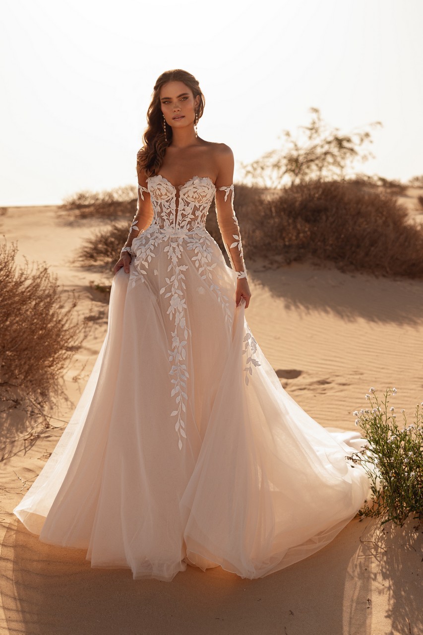 Το φόρεμα Tamara είναι για νύφες που θέλουν μια εμφάνιση που να είναι ταυτόχρονα ντελικάτη και εντυπωσιακή. Το μπούστο σε στυλ κορσέ έχει σχεδιαστεί με βαθύ ντεκολτέ και διακριτικό τελείωμα, που εξισορροπείται από διαφανές τούλι που ρέει αβίαστα σε μια φούστα σε γραμμή Α. Κεντημένες δαντελένιες αναβαθμίδες καταλήγουν από το πάνω μέρος και εκτείνονται κατά μήκος της φούστας, δημιουργώντας ένα φυσικό, χαριτωμένο αποτέλεσμα. Ελαφριά αποσπώμενα μανίκια ολοκληρώνουν την εμφάνιση, δίνοντάς σας την ελευθερία να επιλέξετε ανάμεσα σε ένα ρομαντικό στυλ με ανοιχτούς ώμους ή μια καθαρή σιλουέτα χωρίς τιράντες. Είτε φανταστείτε τον γάμο σας κάτω από τον ανοιχτό ουρανό είτε σε ένα οικείο περιβάλλον, η Tamara κινείται όμορφα και δίνει μια αξέχαστη αίσθηση από κάθε γωνία.