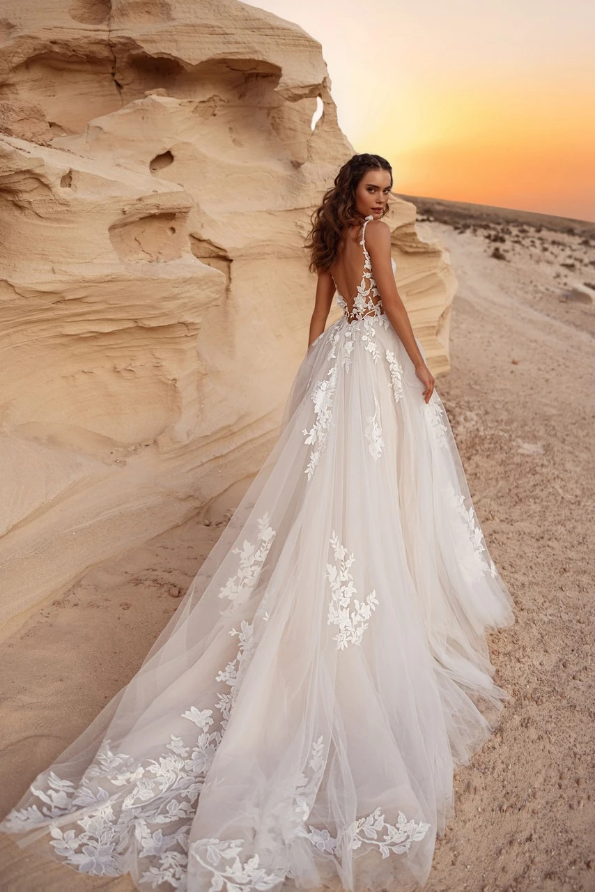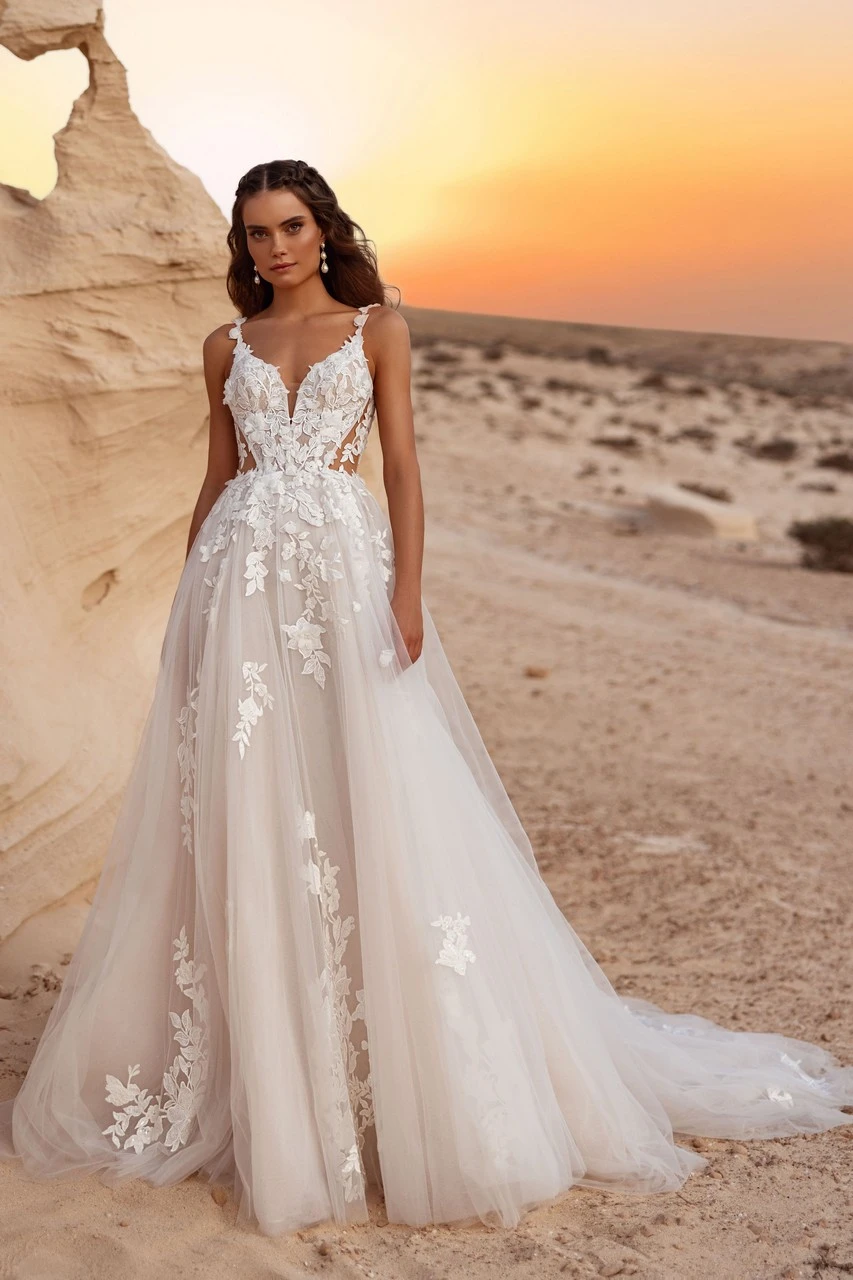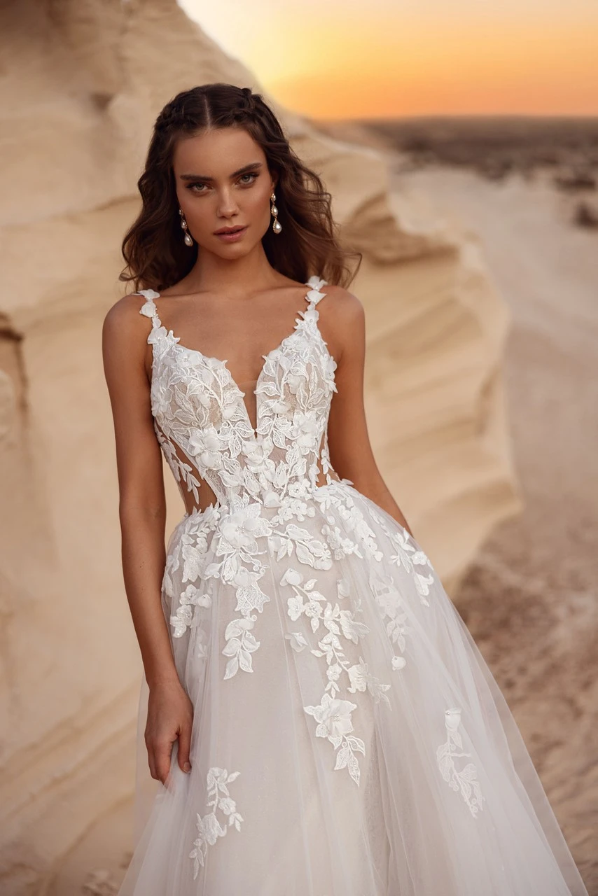 Το φόρεμα Zafira είναι ένας εορτασμός της ελαφρότητας και του ρομαντισμού, σχεδιασμένο για νύφες που θέλουν να αισθάνονται λαμπερές και αξέχαστες. Το εφαρμοστό δαντελένιο μπούστο με τις λεπτές τιράντες αναδεικνύει το ντεκολτέ, ενώ τα ντελικάτα κοψίματα στα πλάγια προσδίδουν μια πινελιά γοητείας. Η ρέουσα φούστα από τούλι, διακοσμημένη με διάσπαρτα φλοράλ απλικέ, δημιουργεί μια απαλή, αέρινη κίνηση με κάθε βήμα, δίνοντας στο φόρεμα γοητεία και φρεσκάδα. Ιδανικό για μια τελετή ηλιοβασιλέματος ή έναν γάμο σε κήπο, αυτό το φόρεμα συνδυάζει την άνεση με την εκπληκτική λεπτομέρεια, αφήνοντας τη νύφη να λάμψει με φυσική ομορφιά και αυτοπεποίθηση.
