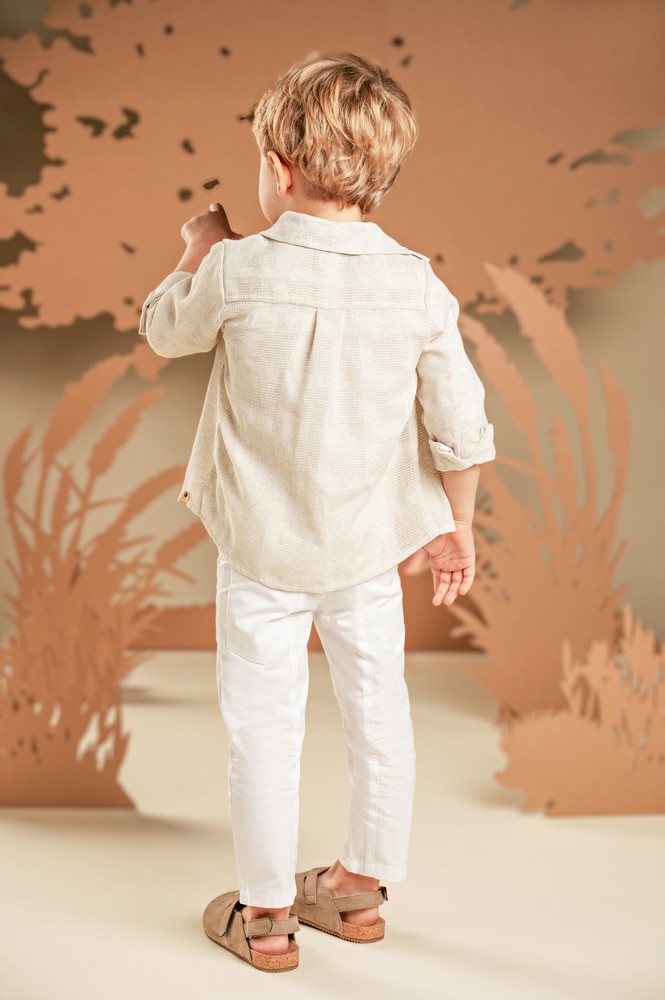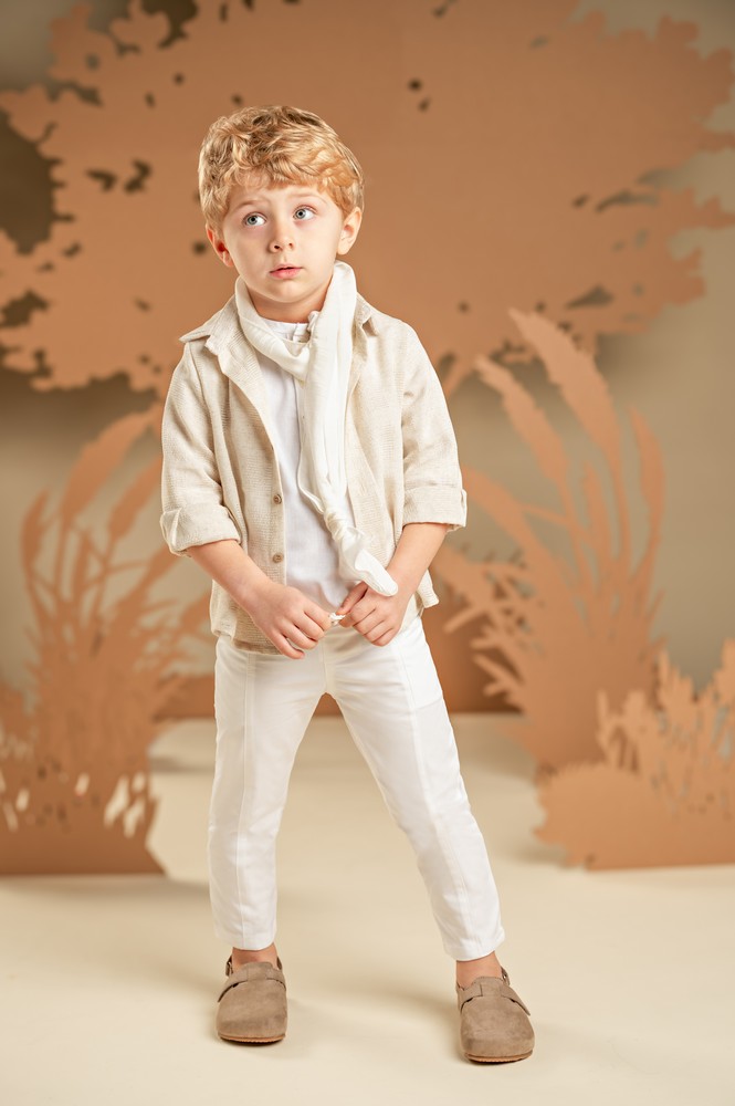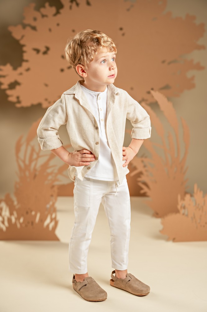 Ένα σύνολο με χαλαρή και σύγχρονη αισθητική, ιδανικό για όσους αγαπούν τις ξεχωριστές εμφανίσεις. Το σετ αποτελείται από παντελόνι σε λευκή καμπαρντίνα με εντυπωσιακά κοψίματα μπροστά και πίσω, συνδυασμένο με 100% λινή λευκή τουνίκ με πατιλέτα για άνεση και δροσιά. Το πουκάμισο από μπεζ υφαντό ύφασμα φοριέται από πάνω, ολοκληρώνοντας το layered look. Για την τελική πινελιά, επιλέξτε ανάμεσα σε ψάθινο καπέλο ή υφασμάτινη τραγιάσκα, ανάλογα με το προσωπικό σας στυλ.