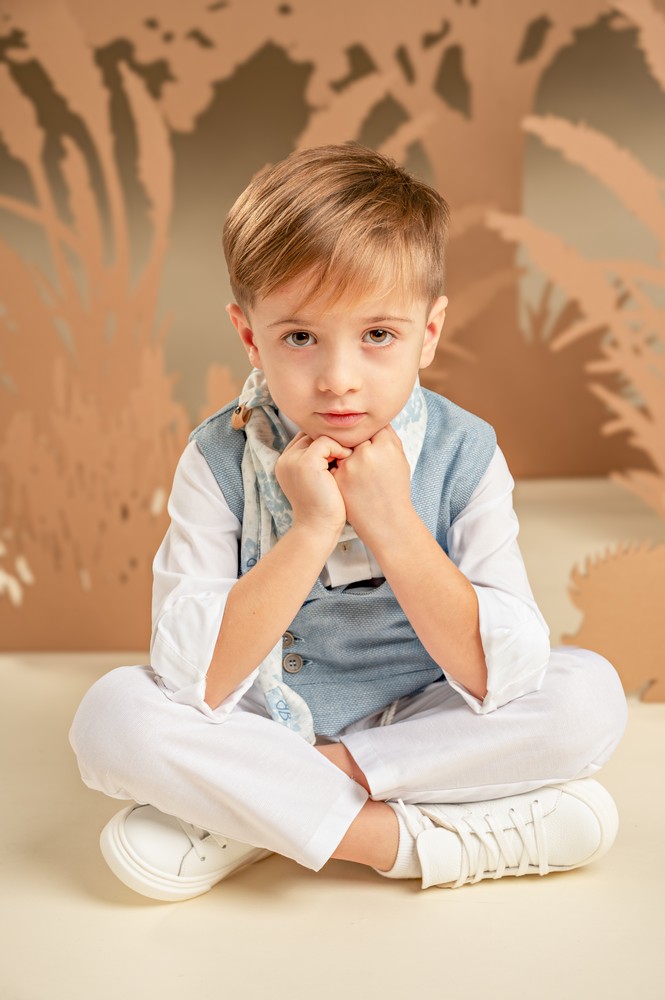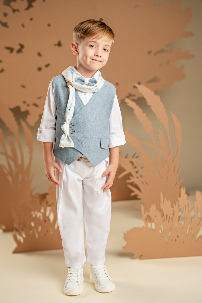 Για εμφάνιση που ξεχωρίζει, αυτό το αγορίστικο σύνολο εντυπωσιάζει με την αρμονία των χρωμάτων και το ιδιαίτερο στυλ του. Το σετ περιλαμβάνει λευκό παντελόνι από cotton-linen ύφασμα με ιδιαίτερες reverse πιέτες και συνδυάζεται με σταυρωτό γιλέκο σε σιελ μελανζέ βαμβακερό ύφασμα και off white βαμβακερό πουκάμισο. To look ολοκληρώνει το φουλάρι από βαμβακερό ύφασμα με μοναδικό baby bloom exclusive φλοράλ εμπριμέ σε σιελ αποχρώσεις, παπιγιόν και ανάλογα με το στιλ που προτιμάτε ψάθινο καπέλο ή υφασμάτινη τραγιάσκα.