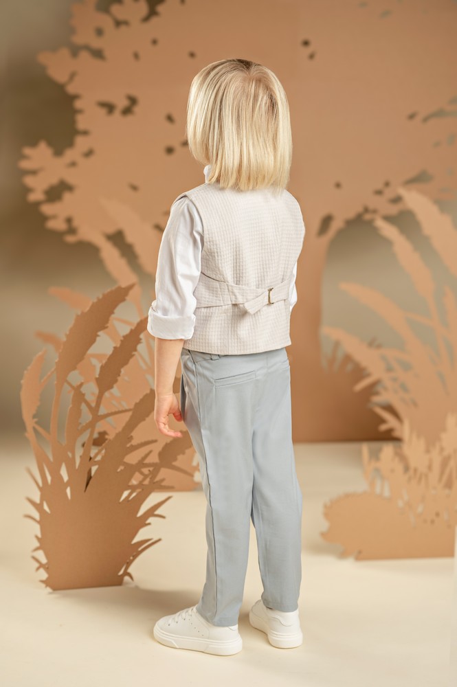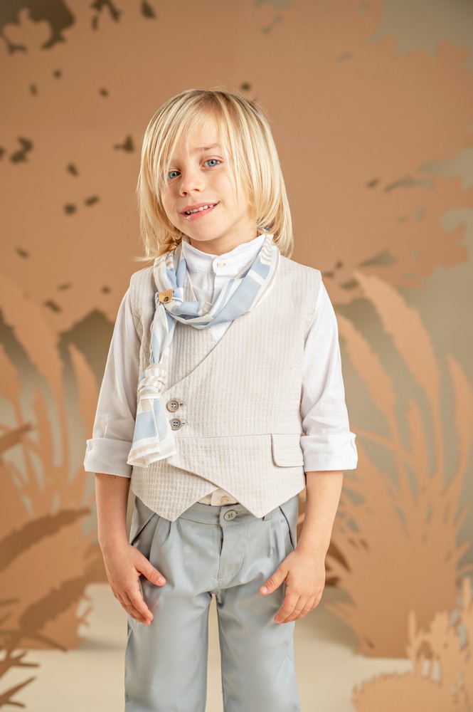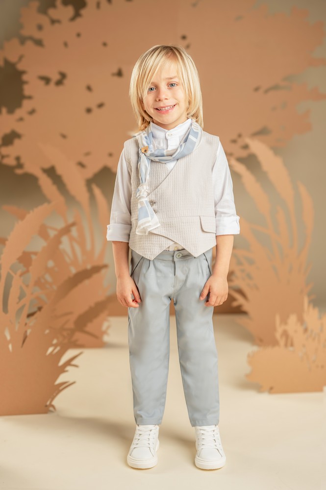 Ένα μοναδικό αγορίστικο σύνολο με προσεγμένες λεπτομέρειες που αναδεικνύουν την υψηλή ποιότητα και τη σύγχρονη αισθητική του. Το σιελ-γκρι δίπιετο παντελόνι από tencel-linen ύφασμα συνδυάζεται εξαιρετικά με το σταυρωτό βαμβακερό γιλέκο από πικέ ύφασμα με ιδιαίτερη πλέξη σε ανοιχτό γκρι. Το off white βαμβακερό πουκάμισο με τον ιδιαίτερο Mao γιακά χαρίζει φρεσκάδα και κομψότητα στο look. Την εμφάνιση ολοκληρώνουν το μακρόστενο φουλάρι από βουάλ εμπριμέ με γεωμετρικά σχέδια baby bloom exclusive σε μπλε-σιελ αποχρώσεις και ανάλογα με το στιλ που προτιμάτε διαλέξτε ανάμεσα στο ψάθινο καπέλο ή την υφασμάτινη τραγιάσκα .