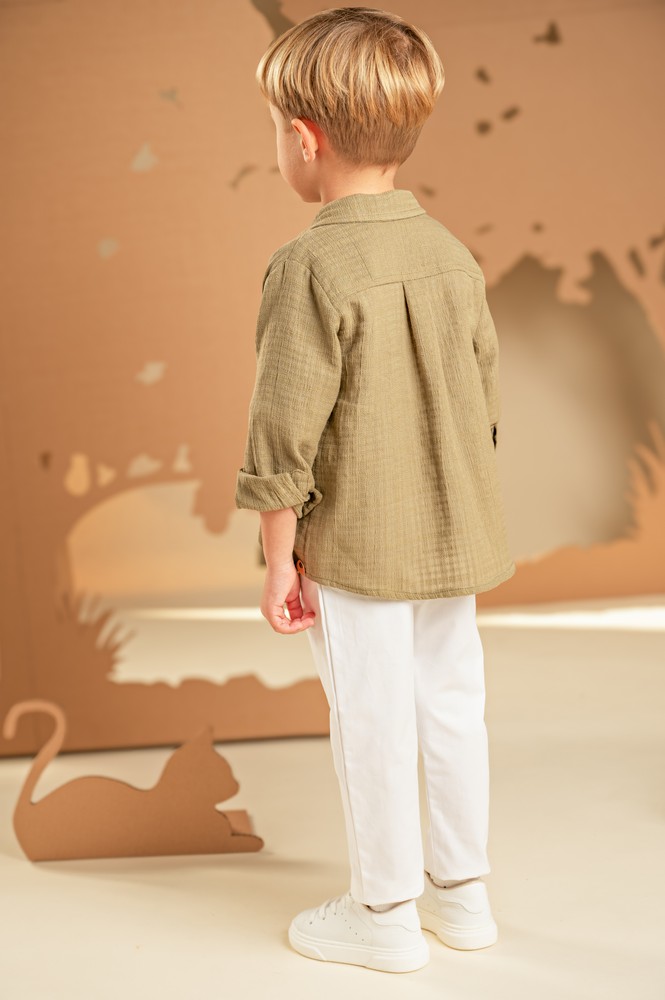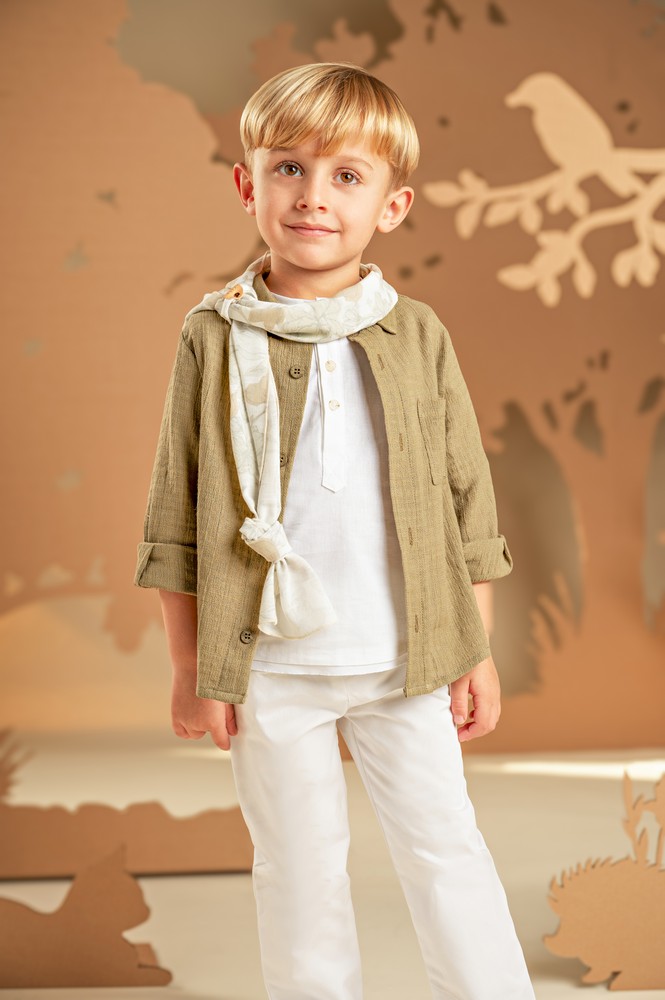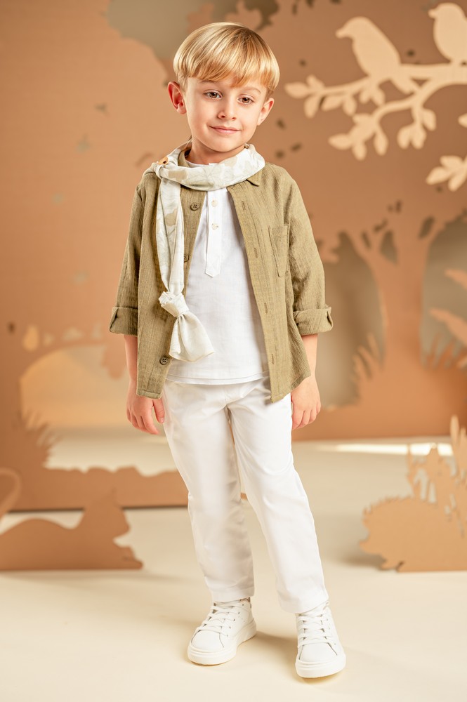 Ένα σύνολο με χαλαρή και σύγχρονη αισθητική, ιδανικό για όσους αγαπούν τις ξεχωριστές εμφανίσεις. Το παντελόνι από λευκή καμπαρντίνα συνδυάζεται με 100% λινή λευκή τουνίκ με πατιλέτα, προσφέροντας άνεση και δροσερή αίσθηση. Από πάνω, το πουκάμισο σε λαδί υπέροχο βαμβακερό υφαντό ύφασμα δίνει έμφαση στο layered look και την πρωτοτυπία της εμφάνισης. Το φουλάρι σε μπεζ αποχρώσεις με φλοράλ τύπωμα Baby Bloom exclusive συμπληρώνει το στυλ, ενώ ως τελική πινελιά μπορείτε να επιλέξετε ανάμεσα σε ψάθινο καπέλο ή υφασμάτινη τραγιάσκα, ανάλογα με το προσωπικό σας γούστο.
