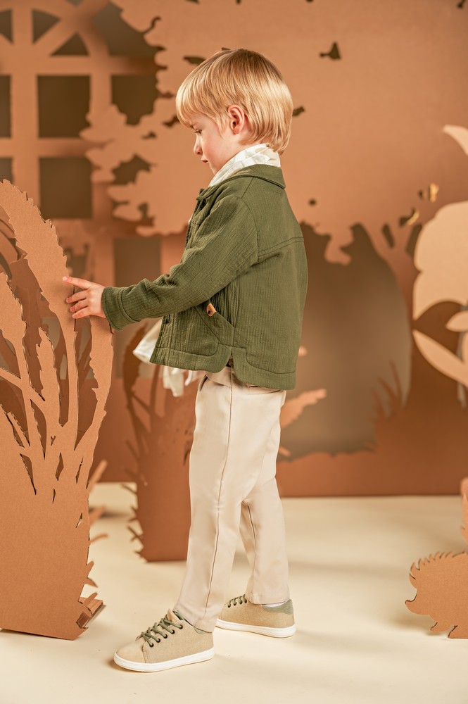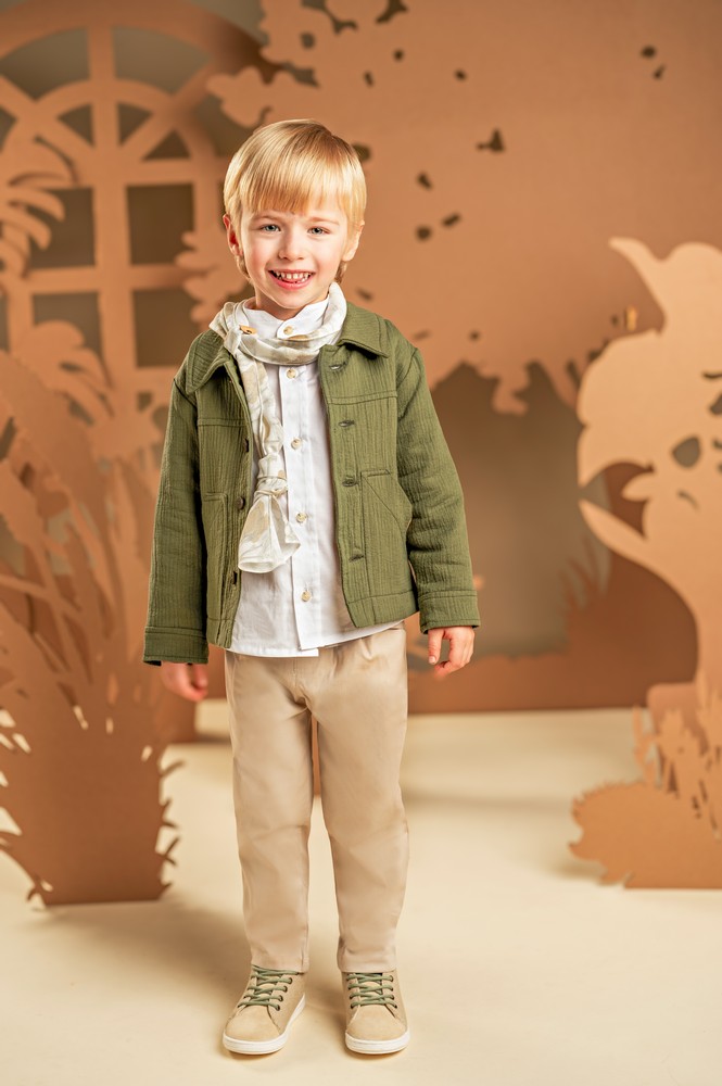 Ένα σύνολο γεμάτο φρεσκάδα, που εντυπωσιάζει με τον υπέροχο συνδυασμό χρωμάτων και υφών. Το σετ περιλαμβάνει παντελόνι από βαμβακερή καμπαρτίνα σε μπεζ απόχρωση και μπουφανάκι με γιακά και εξωτερικές τσέπες από γκοφρέ βαμβακερό ύφασμα σε χακί απόχρωση. Το λευκό βαμβακερό πουκάμισο με τον ιδιαίτερο Mao γιακά φωτίζει και ολοκληρώνει το σύνολο, ενώ το φλοράλ φουλάρι σε μπεζ αποχρώσεις με exclusive τύπωμα Baby Bloom προσθέτει μια ξεχωριστή πινελιά. Για το τελικό αποτέλεσμα, επιλέξτε ανάμεσα σε ψάθινο καπέλο ή υφασμάτινη τραγιάσκα, σύμφωνα με το προσωπικό σας στυλ