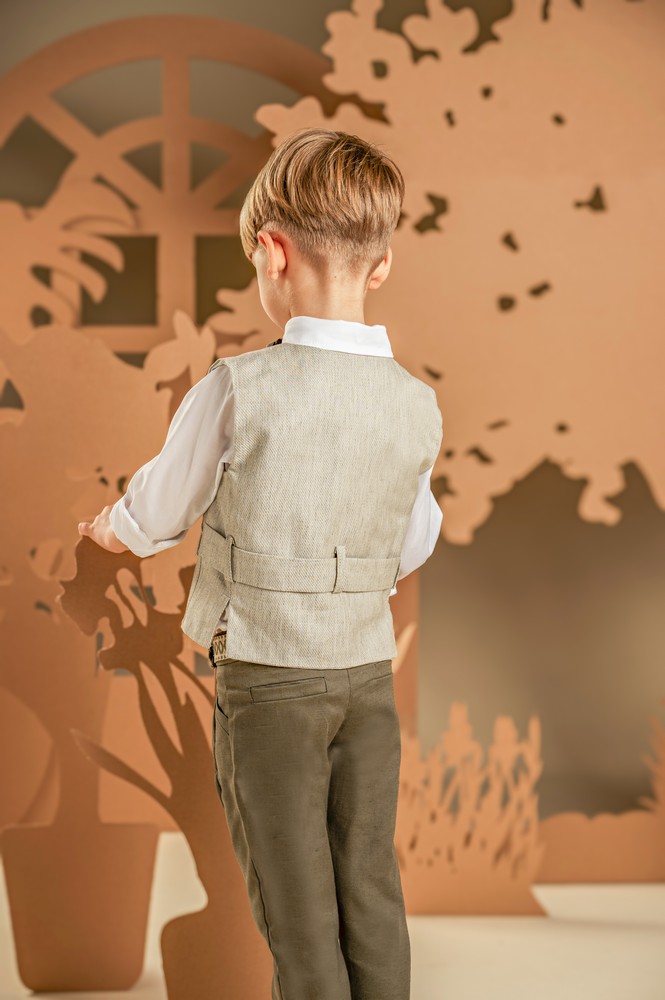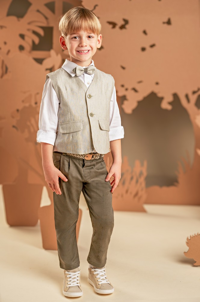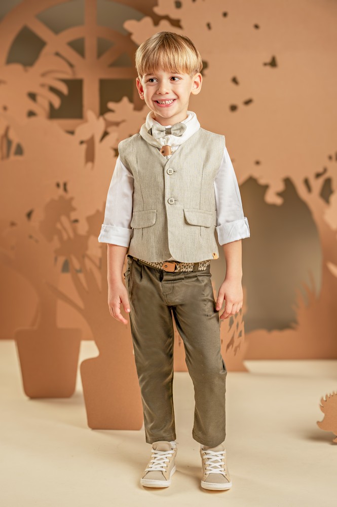 Ένα σύνολο με διαχρονικό χαρακτήρα και ξεχωριστή προσωπικότητα. Το πολύ όμορφο αυτό σετ αποτελείται από παντελόνι με ιδιαίτερο design σε χακί απόχρωση από μαλακό ύφασμα Tencel-cotton-linen. Γιλέκο με εξαιρετικό σχέδιο φτιαγμένο από μελανζέ cotton-linen-tencel ύφασμα στους τόνους του λαδί, λευκό βαμβακερό πουκάμισο, υφαντή ζώνη και δίχρωμο παπιγιόν. Για την τελική πινελιά, επιλέξτε ανάμεσα σε ψάθινο καπέλο ή υφασμάτινη τραγιάσκα, σύμφωνα με το προσωπικό σας στυλ.