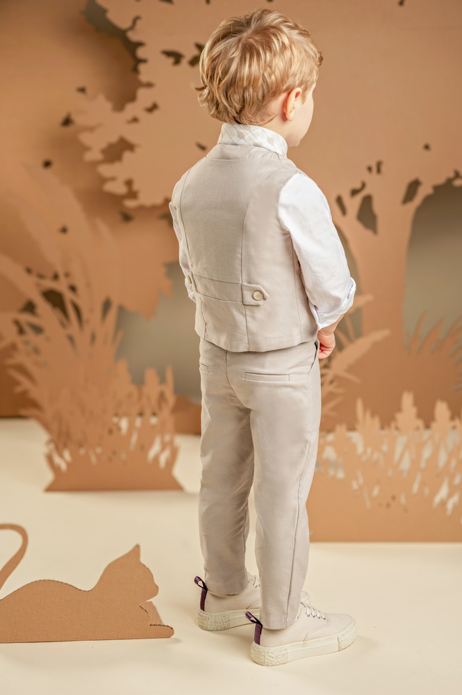 Ένα σύνολο που συνδυάζει κομψότητα και άνεση, με προσεγμένες λεπτομέρειες που το κάνουν να ξεχωρίζει. Δίπιετο παντελόνι με έξτρα λοξή ζώνη και σταυρωτό γιλέκο με γιακά κιμονό και τα δύο φτιαγμένα από βαμβακερό καμβά σε μπεζ χρώμα, συνδυασμένα υπέροχα με λευκό πουκάμισο και φουλάρι με διακριτικά γεωμετρικά σχέδια σε λευκό-μπεζ τόνους . Για την τελική πινελιά, επιλέξτε ανάμεσα σε ψάθινο καπέλο ή υφασμάτινη τραγιάσκα, σύμφωνα με το προσωπικό σας στυλ.