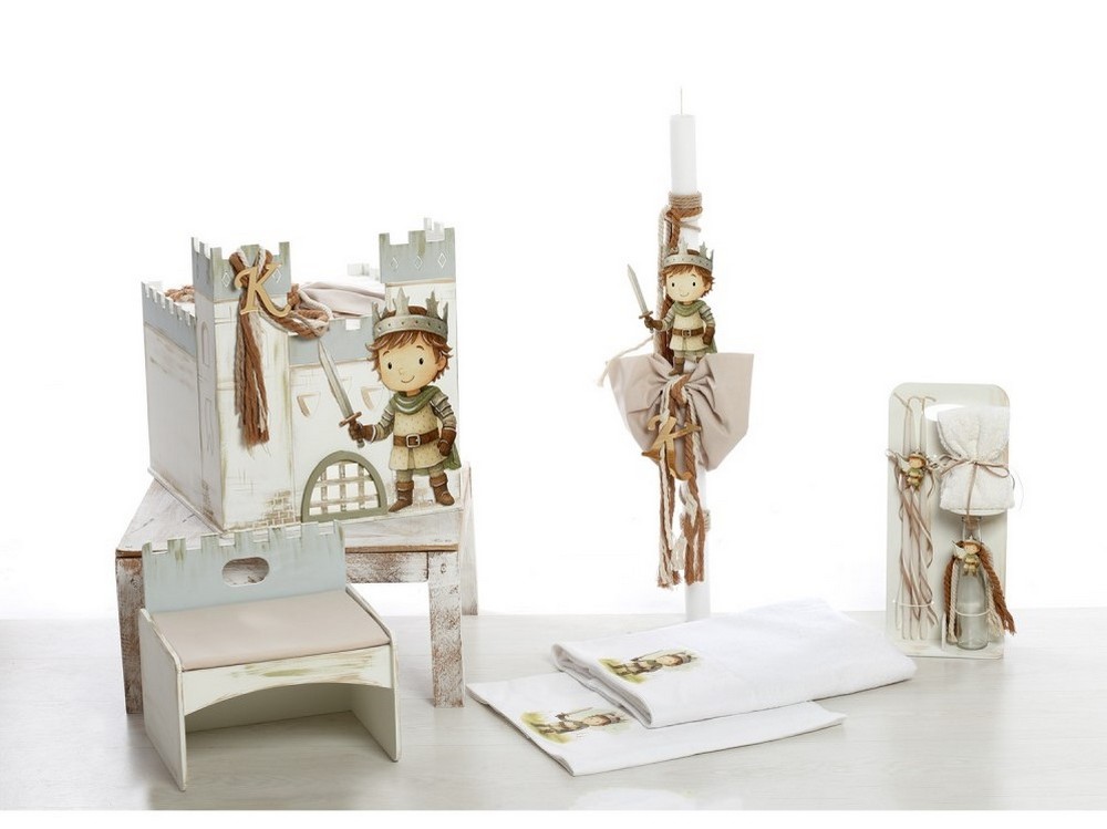 Λαμπάδα: Στολισμένη με μεγάλο υφασμάτινο φιόγκο, σχοινιά, το ξύλινο μονόγραμμα και ξύλινη φιγούρα του μικρού ιππότη.