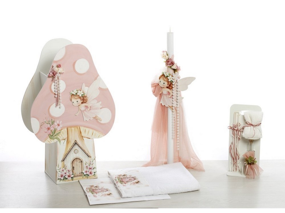 Λαμπάδα: Εντυπωσιακή λαμπάδα στολισμένη με πλούσιο ροζ/σομόν τούλι, κρεμαστές πέρλες, υφασμάτινα λουλούδια και ξύλινη φιγούρα με τη νεράιδα.