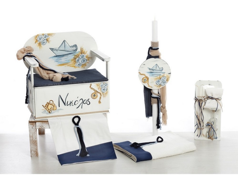 Λαμπάδα: Στολισμένη με πλούσιες γάζες σε μπεζ και navy blue χρώμα, χοντρά σχοινιά και ένα ξύλινο στρογγυλό κάδρο με ζωγραφιστό θέμα το χάρτινο καραβάκι.