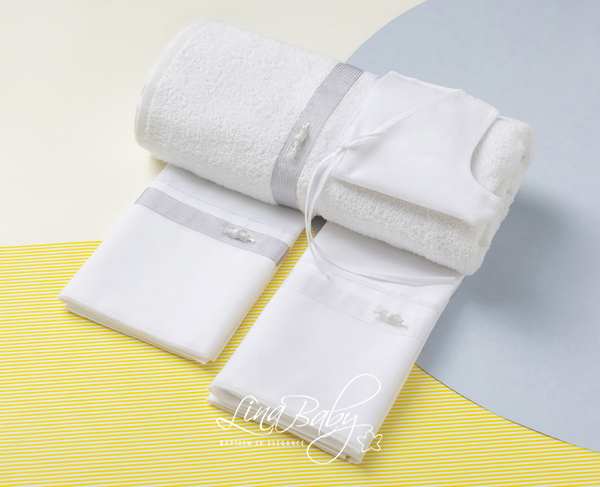 Ένα βαμβακερό σετ λαδόπανων υψηλής αισθητικής, σε λευκές και εκρού παραλλαγές, με σατέν κορδέλα και ριγέ οργαντίνα που αγκαλιάζουν το σχέδιο με αέρινη κομψότητα.