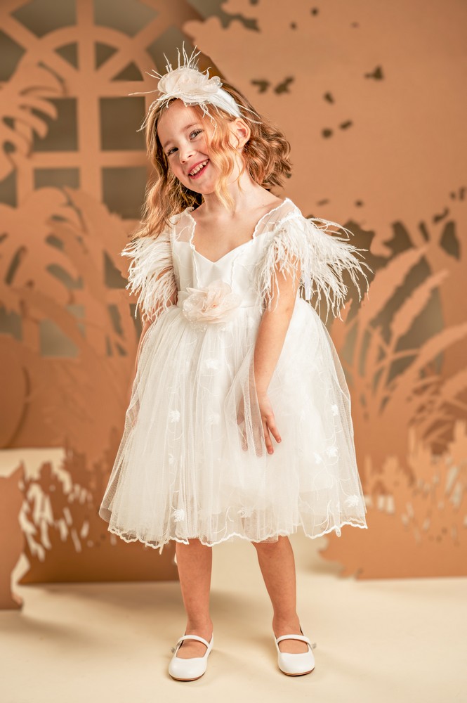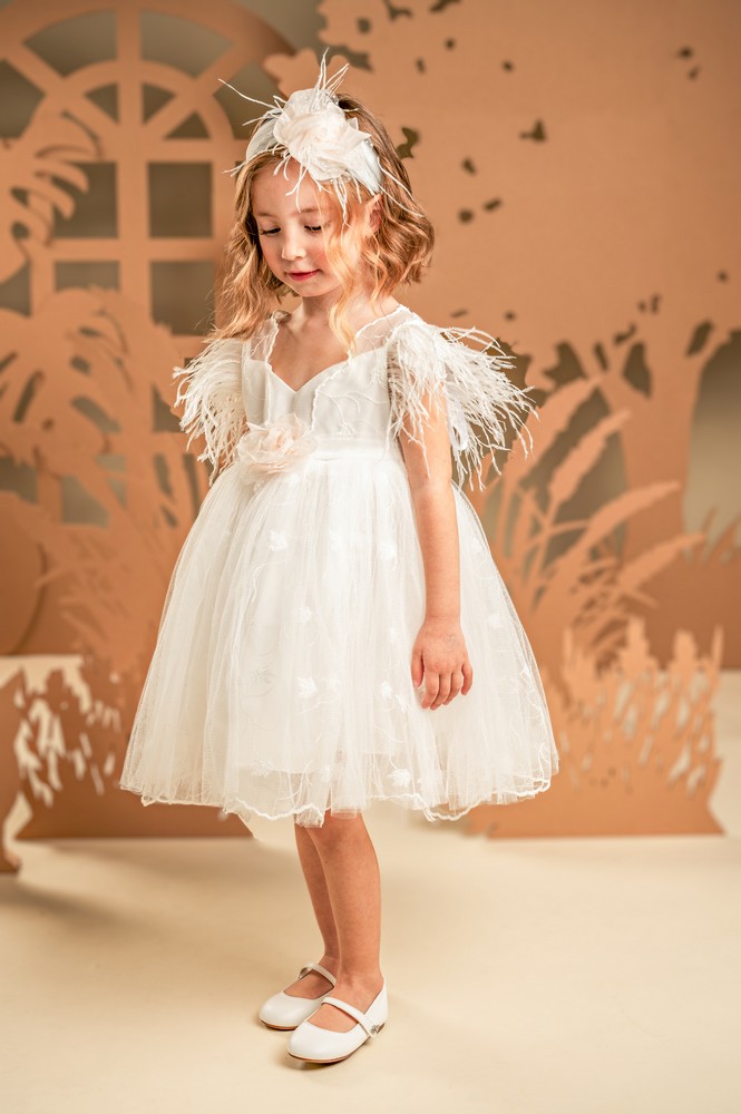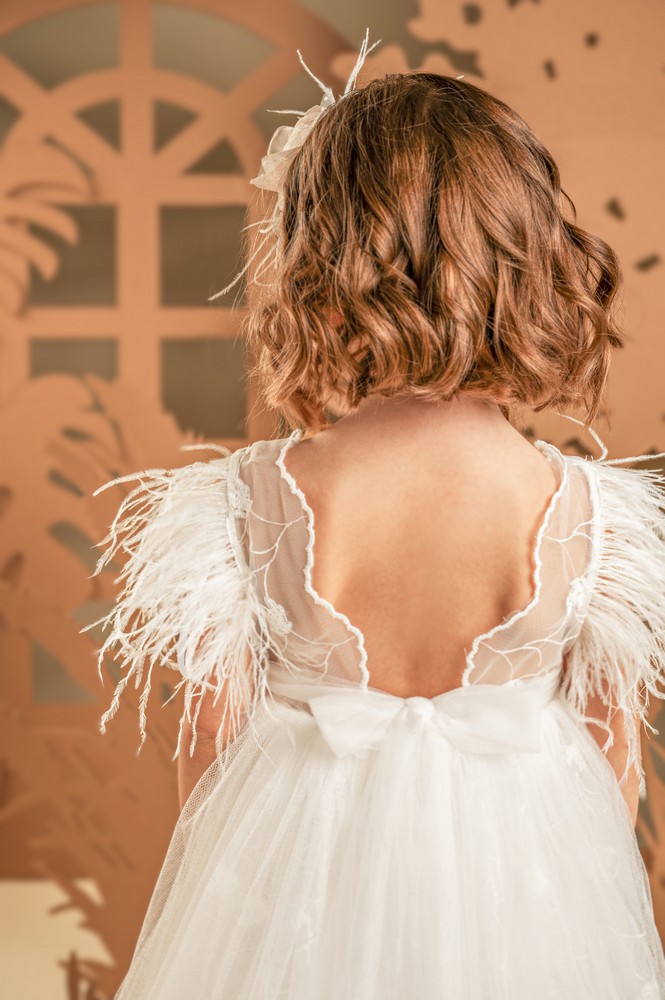 Σε off white χρώμα, αυτό το φόρεμα φτιαγμένο εξολοκλήρου από κεντημένο τούλι, ξεχωρίζει για την ρομαντική αισθητική του. Το μπούστο, σε σχήμα καρδιάς από βαμβακερό ύφασμα ντουμπλάρεται με κεντημένο τούλι που αγκαλιάζει τους ώμους και συνεχίζει στο πίσω μέρος, δημιουργώντας μια εντυπωσιακή διάφανη ανοιχτή πλάτη. Στην θέση των μανικιών, αέρινα φτερά από στρουθοκάμηλο προσθέτουν μια ανάλαφρη, παιχνιδιάρικη αίσθηση. Η φούστα πλούσια, χαρίζει όγκο και κίνηση, ενισχύοντας τη ρομαντική φύση του σχεδίου. Το φόρεμα ολοκληρώνεται με το υπέροχο χειροποίητο λουλούδι σε απαλές αποχρώσεις της πούδρας που στολίζουν το μπούστο αλλά και την τούλινη κορδέλα για τα μαλλιά.