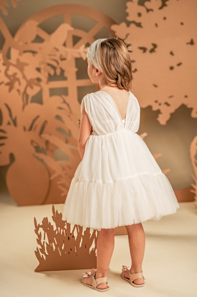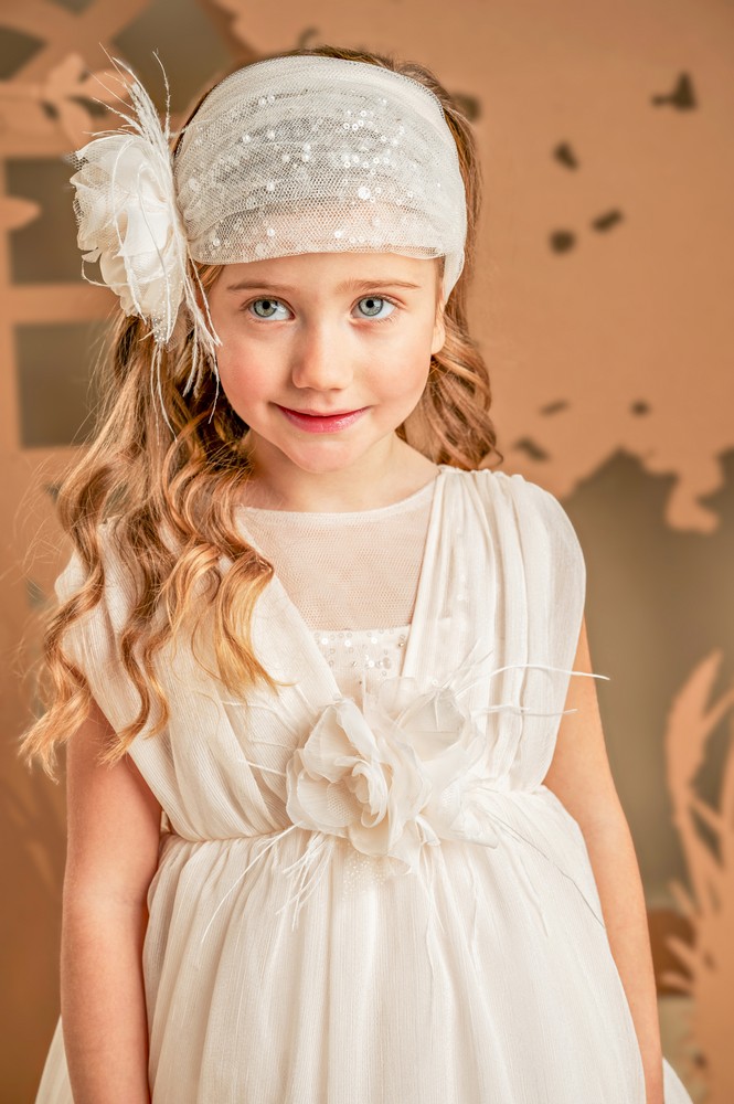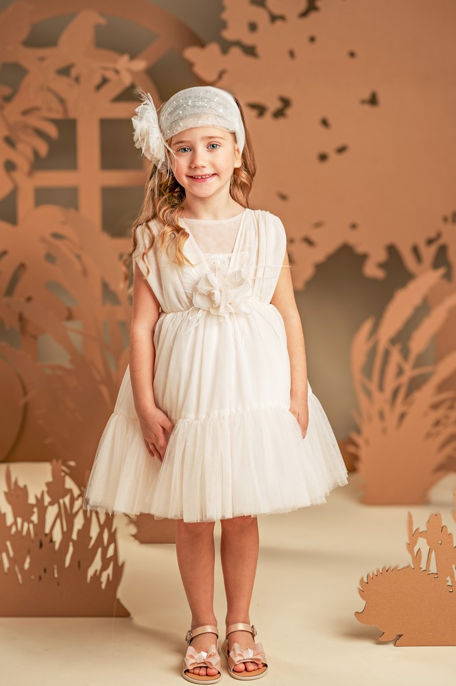 Ένα «ζαχαρωτό» φόρεμα στις αποχρώσεις της πούδρας, φτιαγμένο από γκοφρέ μουσελίνα και μαλακό τούλι. Το μπούστο ντουμπλαρισμένο στο στήθος με ύφασμα από παγιέτες για επιπλέον λάμψη,  διαθέτει ντραπαριστές τιράντες από μουσελίνα και ανοιχτή πλάτη. Η πλούσια φούστα με το φαρδύ βολάν στο τελείωμα στολίζεται κομψά με δύο υπέροχα χειροποίητα λουλούδια στους ίδιους χρωματισμούς. Το σύνολο ολοκληρώνεται με μια τούλινη κορδέλα με παγιέτες για τα μαλλιά, διακοσμημένη και αυτή με ένα μεγάλο χειροποίητο λουλούδι.