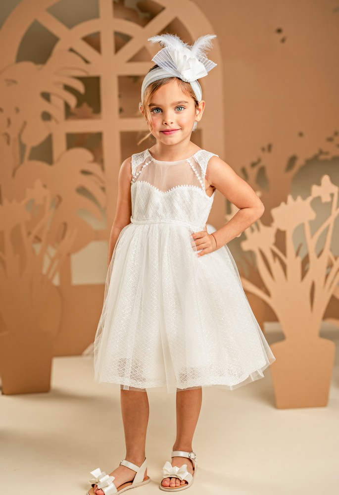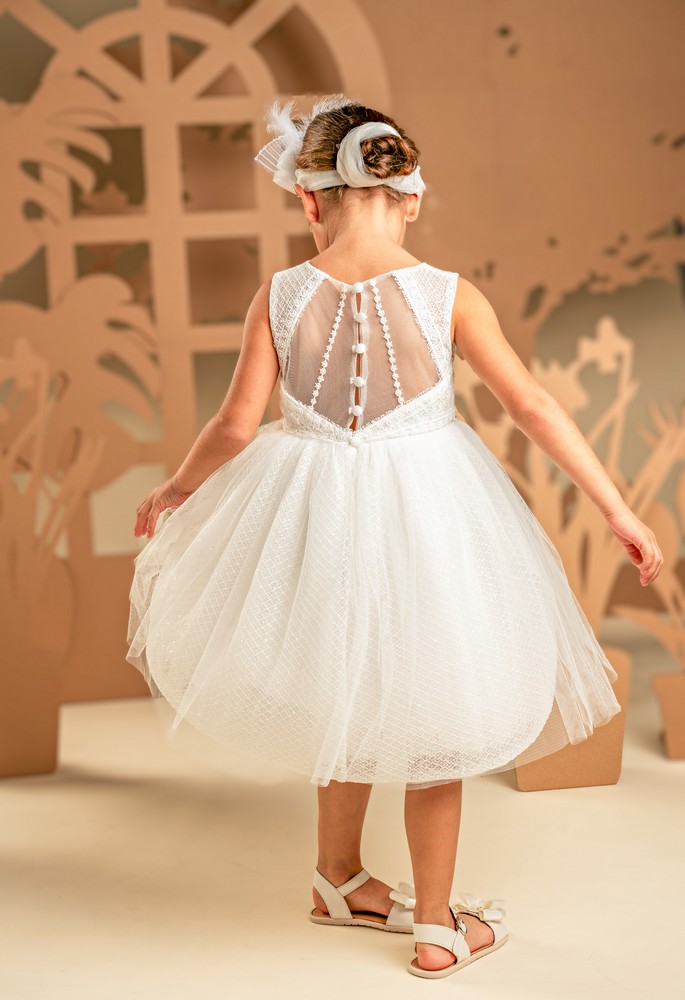 Ένα υπέροχο φόρεμα για όσες αγαπούν τη διακριτική λάμψη, σε off white χρώμα. Το μπούστο είναι φτιαγμένο από τούλι, ντουμπλαρισμένο στο στήθος και στην πλάτη με διχτυωτό ύφασμα με παγιέτες, παίζοντας όμορφα με τις διαφάνειες. Η πλούσια φούστα είναι επίσης κατασκευασμένη από το ίδιο διχτυωτό ύφασμα με παγιέτες και τούλι, προσδίδοντας έξτρα λάμψη σε κάθε κίνηση. Το look ολοκληρώνει άψογα η τούλινη κορδέλα για τα μαλλιά σε στυλ κουάφ.