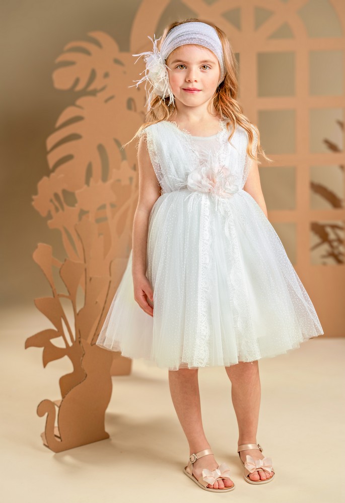 Ένα ρομαντικό και αιθέριο φόρεμα, φτιαγμένο από μαλακό τούλι σε απαλή απόχρωση του acquamarine. Το μπούστο με πλούσιο ντραπέ στολίζεται κομψά με γαλλική δαντέλα, ενώ η φούστα με τις πολλαπλές στρώσεις από τούλι διακοσμείται με ένα χειροποίητο λουλούδι σε παστέλ χρώματα στο στήθος και ένα διακριτικό φιόγκο από δαντέλα στο πίσω μέρος. Η τούλινη κορδέλα για τα μαλλιά, διακοσμημένη επίσης με ένα μεγάλο λουλούδι και φτερά, ολοκληρώνει μοναδικά το look.