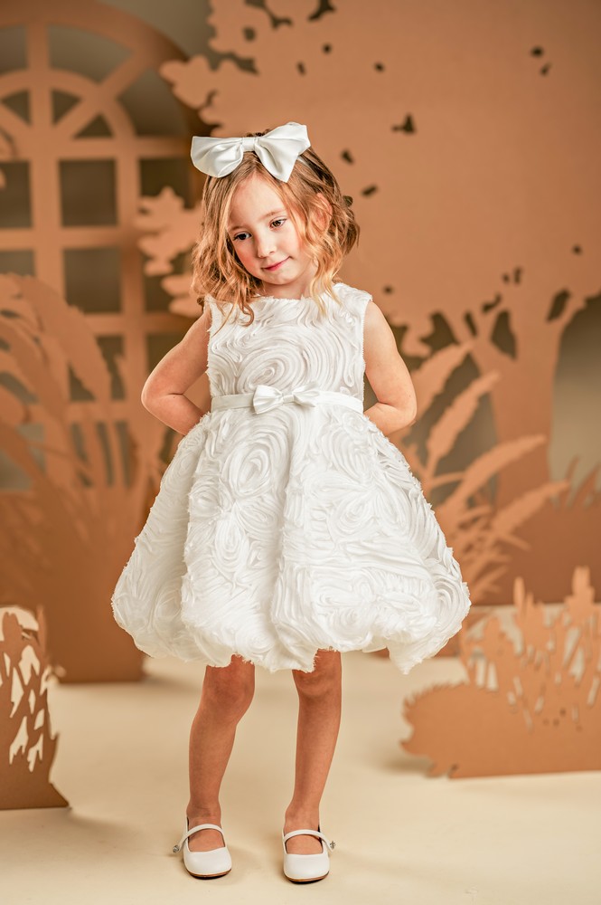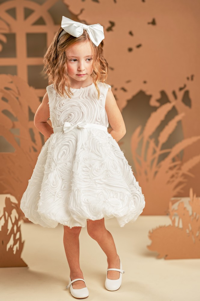 Ένα κουκλίστικο φόρεμα, φτιαγμένο εξολοκλήρου από μοναδικό ύφασμα με απλικέ κυματιστό μοτίφ σε off white απόχρωση, ντουμπλαρισμένο με τούλι γκλίτερ για διακριτική λάμψη. Το μπούστο απλό μπροστά, διαθέτει υπέροχη ανοιχτή πλάτη στο πίσω μέρος, ενώ η πλούσια φούστα μπαλούν με τη σατέν ζώνη στη μέση στολίζεται υπέροχα με σατέν φιόγκους. Το σύνολο ολοκληρώνεται με την τούλινη κορδέλα για τα μαλλιά διακοσμημένη με ένα μεγάλο σατέν φιόγκο ασορτί με το φόρεμα δίνοντας έμφαση στο girly look.