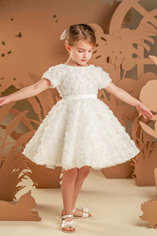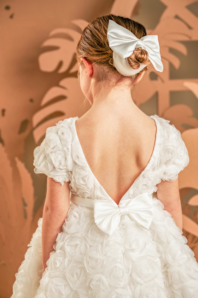 Ένα φόρεμα γεμάτο ποίηση, φτιαγμένο εξολοκλήρου από μοναδικό ύφασμα με απλικέ τριαντάφυλλα σε off white απόχρωση, ντουμπλαρισμένο με μαλακό τούλι. Το μπούστο με μανικάκι διαθέτει υπέροχη ανοιχτή πλάτη, ενώ η πλούσια φούστα-ομπρέλα με τη σατέν ζώνη στη μέση, που καταλήγει σε φιόγκο, ολοκληρώνουν την ονειρική εικόνα αυτού του μοναδικού φορέματος. Το σύνολο περιλαμβάνει τούλινη κορδέλα για τα μαλλιά στολισμένη με σατέν φιόγκο ασορτί με το φόρεμα.
