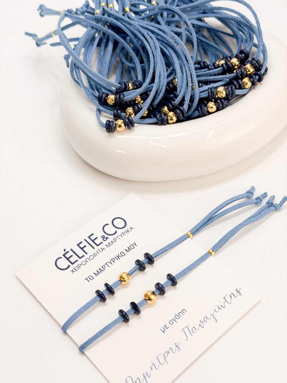 Μαρτυρικό βραχιόλι με μπλε ραφ σουετ κορδόνι,επιχρυσωμένο σταυρό και κεραμικές ροδέλες.
