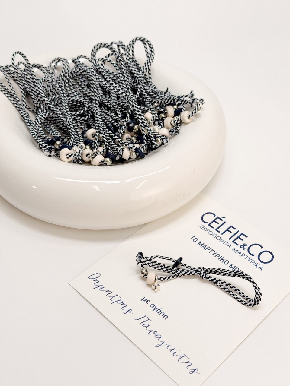 Μαρτυρικό πέτο με δίχρωμο κορδόνι μπλε σκούρο και άσπρο,κεραμικές χάντρες,σταυρό και χάντρα σε ασημί απόχρωση.