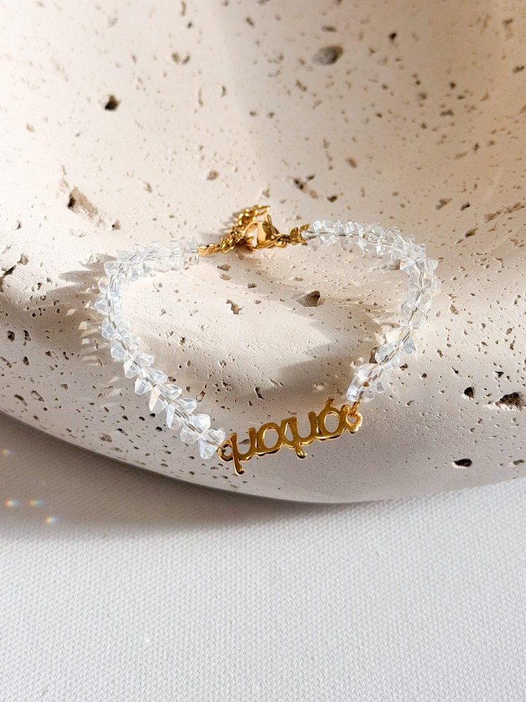 Βραχιολάκι με διάφανα κρύσταλλα και επιχρυσωμένη επιγραφή μαμά,νονά,γιαγιά.