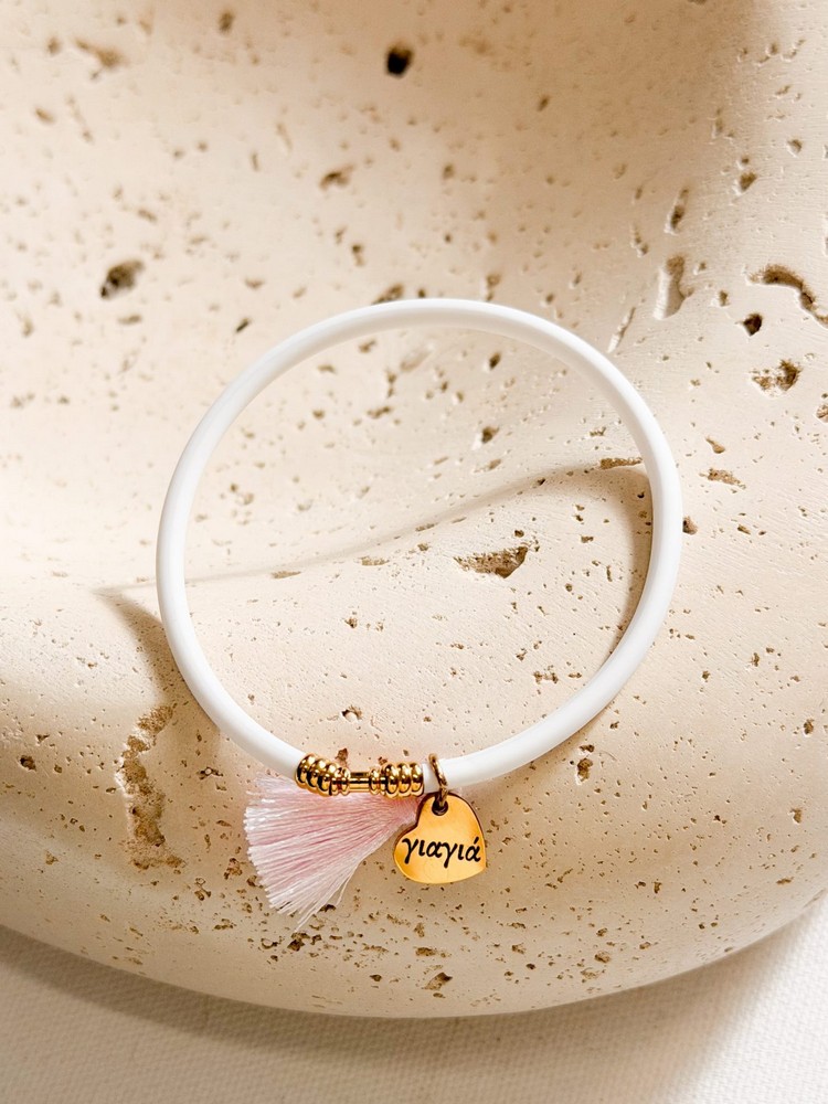 Βραχιολάκι με καουτσουκ κορδόνι,ροζ φούντα και μοτιφ καρδια για την μαμά,νονά και γιαγιά.