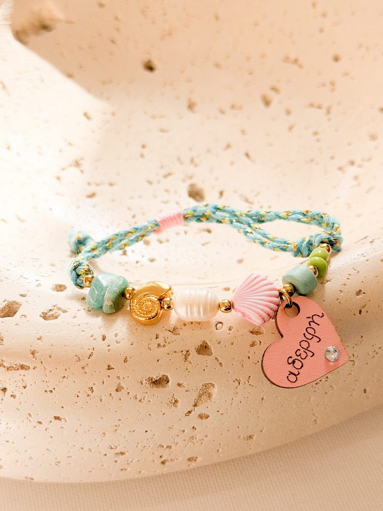 Βραχιολάκι για την αδερφή με χρωματιστό κορδόνι,μοτιφ αδερφή ξύλινο,κοχύλια και χρωματιστές χάντρες και ροδέλες.