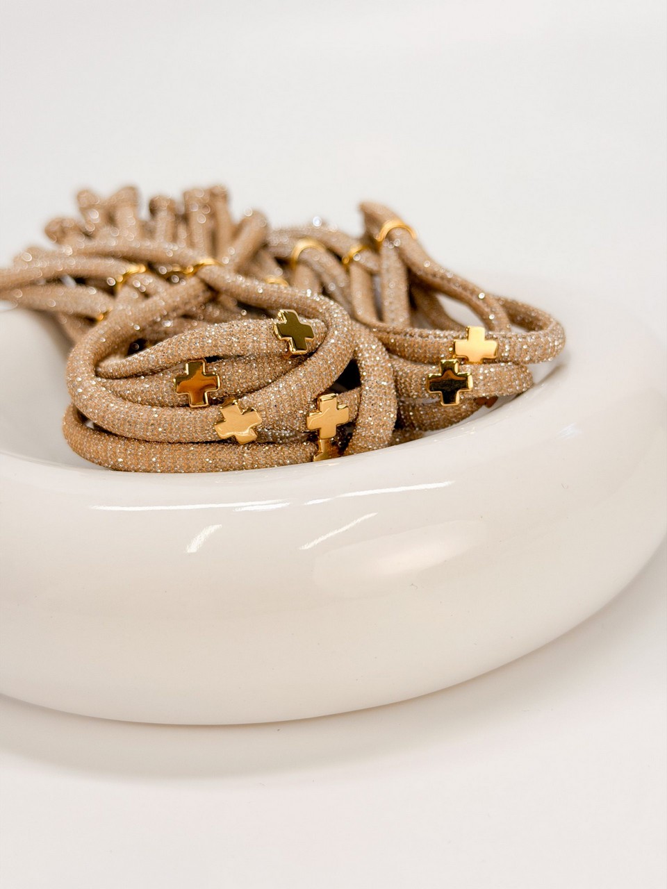 Μαρτυρικό βραχιόλι με μπεζ κορδόνι με ασημοκλωστή και επιχρυσωμένο σταυρό.