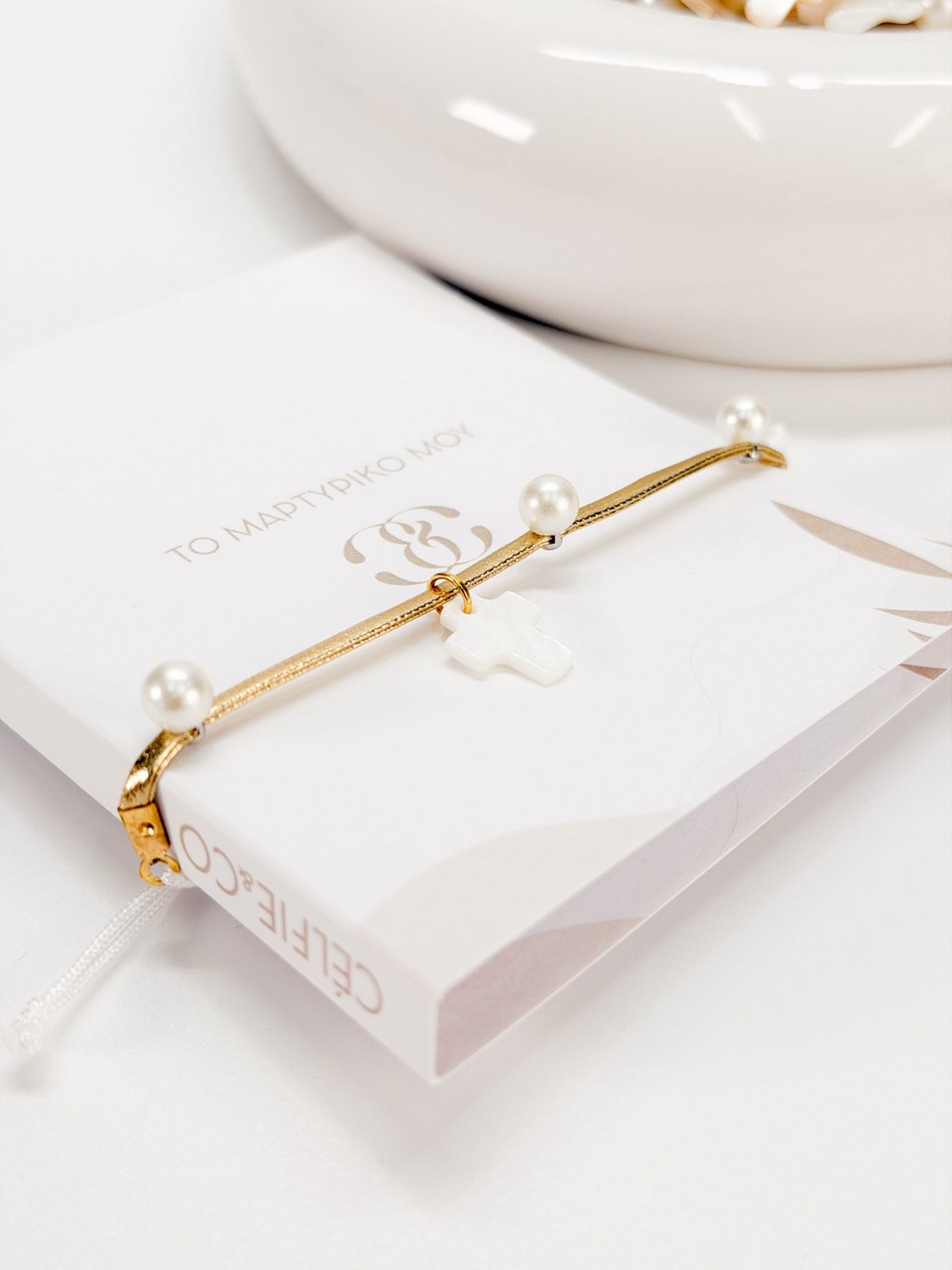Μαρτυρικό βραχιόλι με χρυσό κορδόνι με πέρλες, φίλντισι σταυρό και λευκό σατέν δέσιμο.