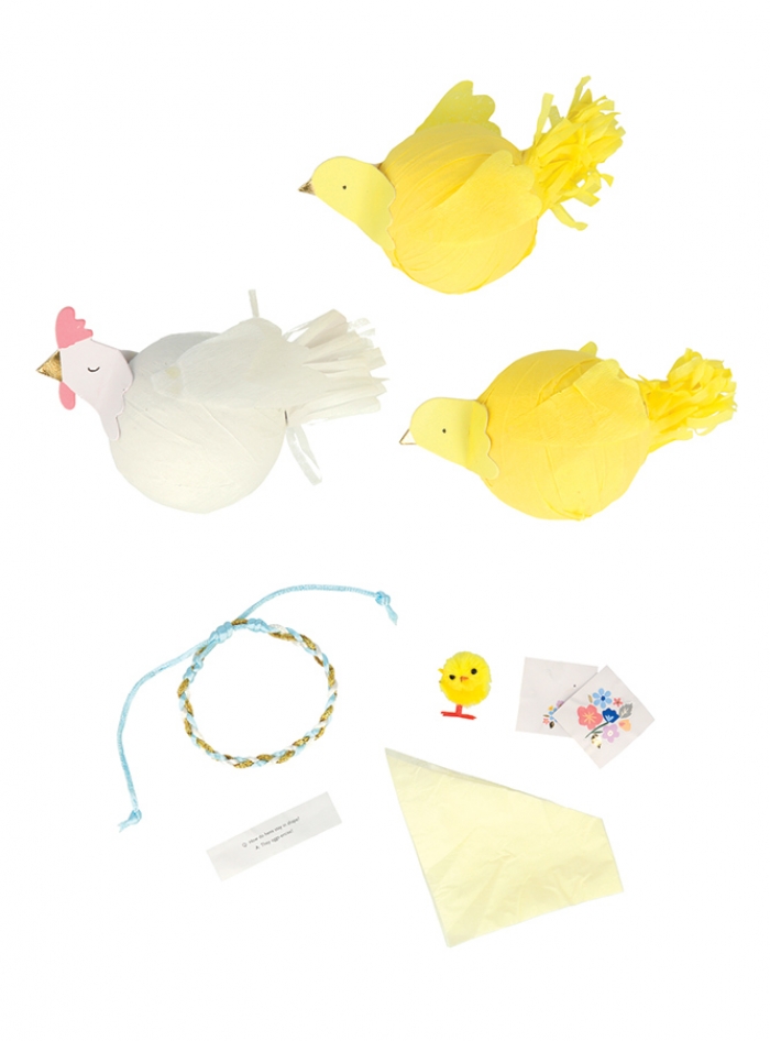 Κάθε μπαλίτσα περιλαμβάνει 1 χνουδωτό κοτοπουλάκι, 2 αυτοκόλλητα, 1 χάρτινο καπελάκι, 1 βραχιολάκι και 1 αστείο.