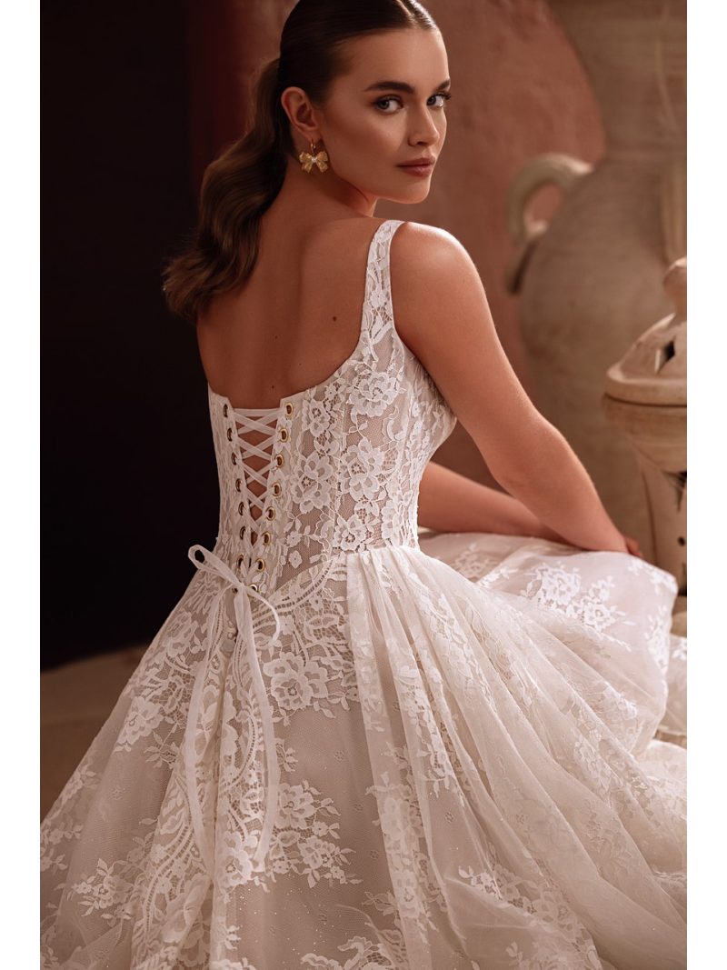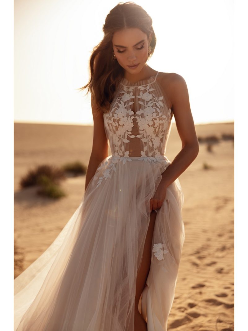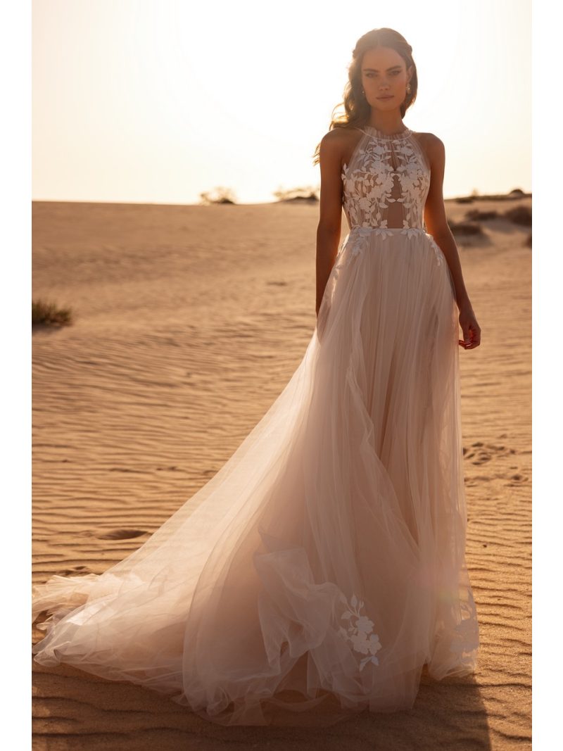 Το φόρεμα Ellie είναι σχεδιασμένο για νύφες που θέλουν μια ανάλαφρη, αβίαστη εμφάνιση, ενώ παράλληλα εντυπωσιάζουν. Η λαιμόκοψη με τιράντες και το διαφανές μπούστο με φλοράλ απλικέ δημιουργούν μια φρέσκια και ρομαντική ατμόσφαιρα, ενώ οι απαλές στρώσεις τούλι ρέουν σε μια φούστα που κινείται με χάρη σε κάθε βήμα. Η ανοιχτή πλάτη, δεμένη με λεπτές κορδέλες, προσθέτει μια παιχνιδιάρικη πινελιά, κάνοντας αυτό το φόρεμα να φαίνεται θηλυκό και χαλαρό. Ιδανικό για έναν γάμο σε εξωτερικό χώρο, σας δίνει την ελευθερία να νιώθετε άνετα και με αυτοπεποίθηση όλη την ημέρα.