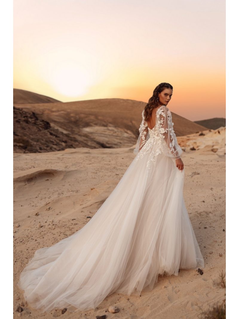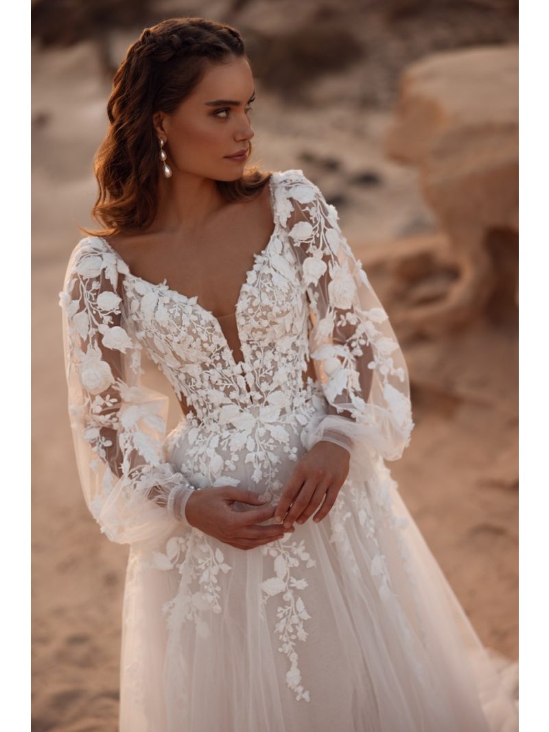 Το φόρεμα Farida είναι φτιαγμένο για νύφες που ονειρεύονται μια εμφάνιση εντυπωσιακή και ρομαντική. Το εφαρμοστό μπούστο καλύπτεται από περίτεχνα φλοράλ απλικέ που συνεχίζονται στα μακριά διάφανα μανίκια, δημιουργώντας μια απαλή αλλά και κομψή σιλουέτα. Το βαθύ ντεκολτέ προσθέτει μια πινελιά γοητείας, ενώ η ρέουσα φούστα από τούλι και η μακριά ουρά προσφέρουν αβίαστη κίνηση και ανάλαφρη αίσθηση. Είναι ένα φόρεμα που ισορροπεί τη λεπτομέρεια με την ελευθερία, ιδανικό για να περπατήσετε στον διάδρομο και να χορέψετε όλη τη νύχτα.