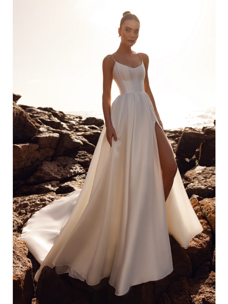 Το Alya είναι ένα φόρεμα που ενσαρκώνει τη μοντέρνα κομψότητα με μια άνετη και γεμάτη αυτοπεποίθηση γραμμή. Το λιτό μπούστο με τις λεπτές τιράντες δημιουργεί ένα κομψό και εκλεπτυσμένο σχήμα, ενώ η φαρδιά φούστα με το τολμηρό σκίσιμο προσθέτει κίνηση και γοητεία. Ο μινιμαλιστικός σχεδιασμός τραβάει την προσοχή στη φυσική ομορφιά της νύφης, αποδεικνύοντας ότι η απλότητα μπορεί να είναι τόσο ισχυρή όσο και οι περίπλοκες λεπτομέρειες. Με κάθε βήμα, η Alya εξισορροπεί τη διαχρονική κομψότητα με ένα φρέσκο, σύγχρονο πνεύμα. Αυτό το φόρεμα δημιουργήθηκε για νύφες που θέλουν να αισθάνονται χαριτωμένες, σίγουρες και αξέχαστες την ημέρα του γάμου τους - μια εμφάνιση που είναι ταυτόχρονα κλασική και εντυπωσιακά μοντέρνα.
