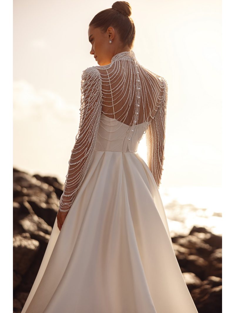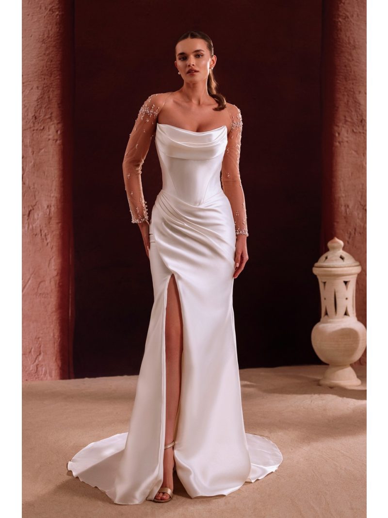Το Aylin είναι ένα νυφικό που δημιουργήθηκε για νύφες που επιθυμούν κομψότητα με διακριτικές άκρες. Η απαλή σατέν βάση εφαρμόζει όμορφα γύρω από το σώμα, ενώ το απαλό ντραπέ ντεκολτέ προσθέτει διάσταση χωρίς να αφαιρεί την καθαρή σιλουέτα. Τα διάφανα μανίκια, διακοσμημένα με λεπτές πέρλες, δημιουργούν μια πινελιά λάμψης που δίνει μια αίσθηση εκλεπτυσμένης και όχι υπερβολικής. Το μπροστινό σκίσιμο προσθέτει κίνηση και μια νότα τόλμης, καθιστώντας το φόρεμα χαριτωμένο και αξέχαστο. Η αποσπώμενη overskirt δίνει στις νύφες την ελευθερία να επιλέξουν ανάμεσα σε μια κομψή εφαρμοστή εμφάνιση και μια εντυπωσιακή ουρά, προσφέροντας ευελιξία για την τελετή και τον εορτασμό που ακολουθεί.