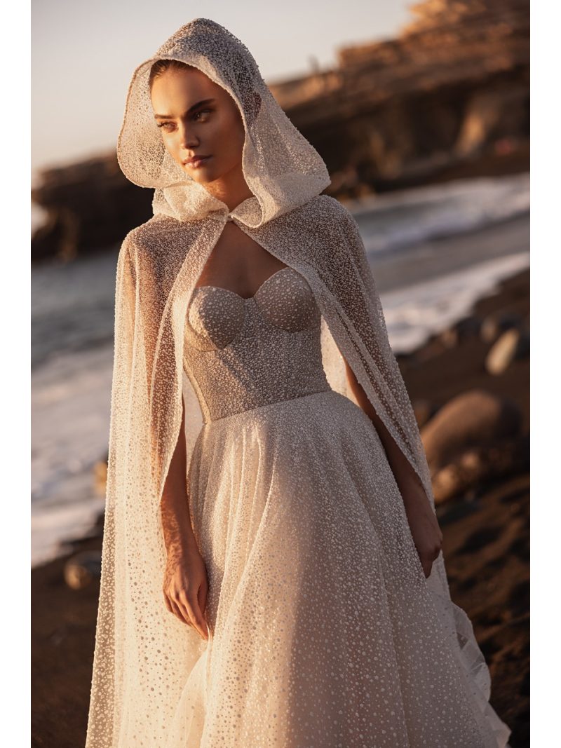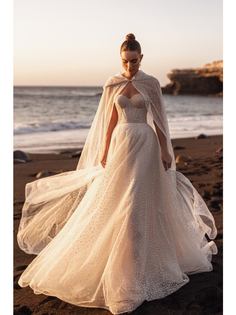 Το Etra είναι ένα νυφικό που δημιουργήθηκε για νύφες που θέλουν μια δυναμική αλλά και θηλυκή εμφάνιση. Η καθαρή σιλουέτα ρέει σε μια απαλή ουρά, ενώ το εφαρμοστό δαντελένιο μπούστο αναδεικνύει τη σιλουέτα με διακριτική δομή. Το αποσπώμενο δαντελένιο μπολερό είναι το κεντρικό κομμάτι αυτού του σχεδίου, με ψηλή λαιμόκοψη και εντυπωσιακό ντραπέ που μοιάζει με κάπα, που μετατρέπει το νυφικό από ρομαντικό σε εντυπωσιακό στη στιγμή. Με το ρέον ύφασμα και το τολμηρό μπροστινό σκίσιμο, το Etra επιτρέπει στη νύφη να νιώθει χαριτωμένη, σίγουρη και εντελώς αξέχαστη την ημέρα του γάμου της.