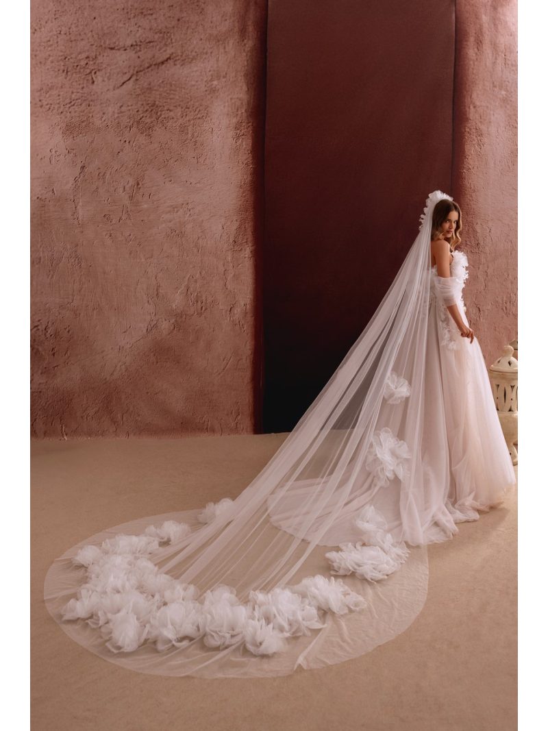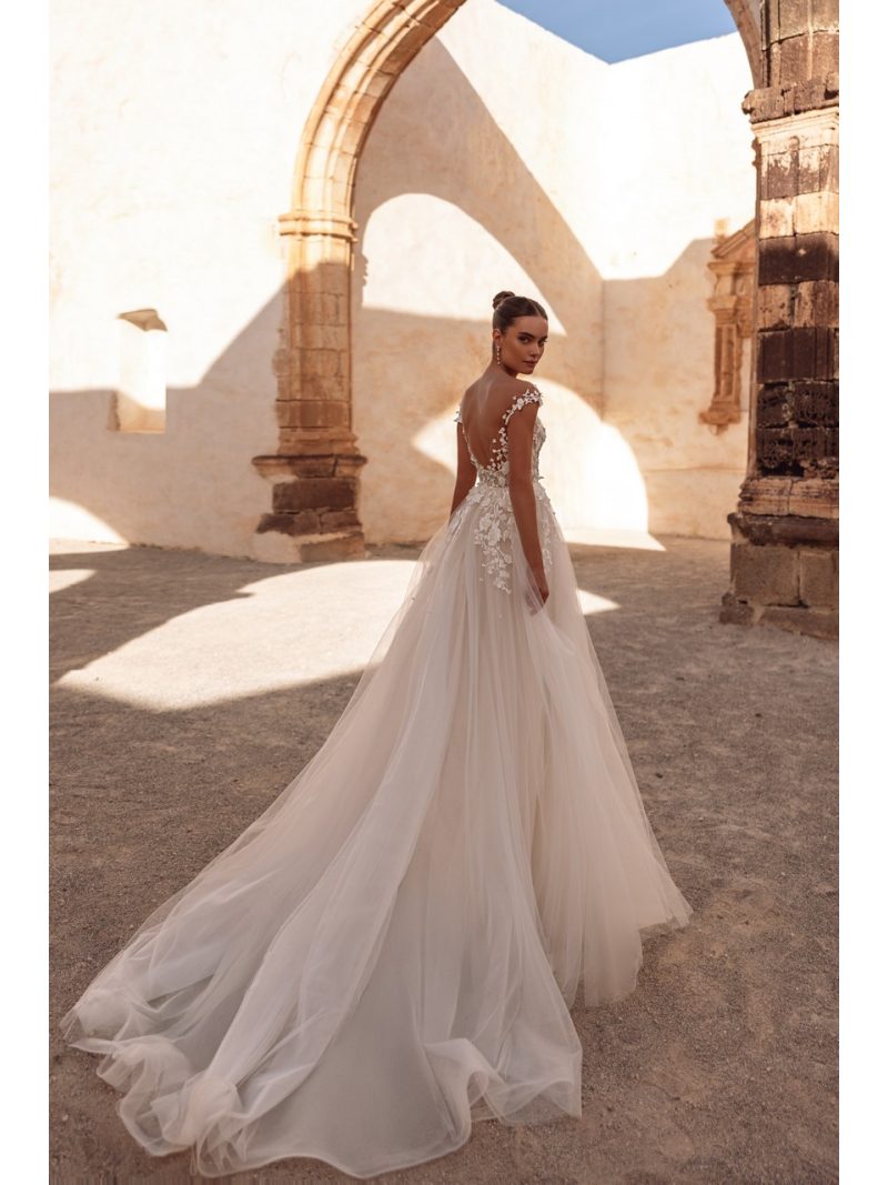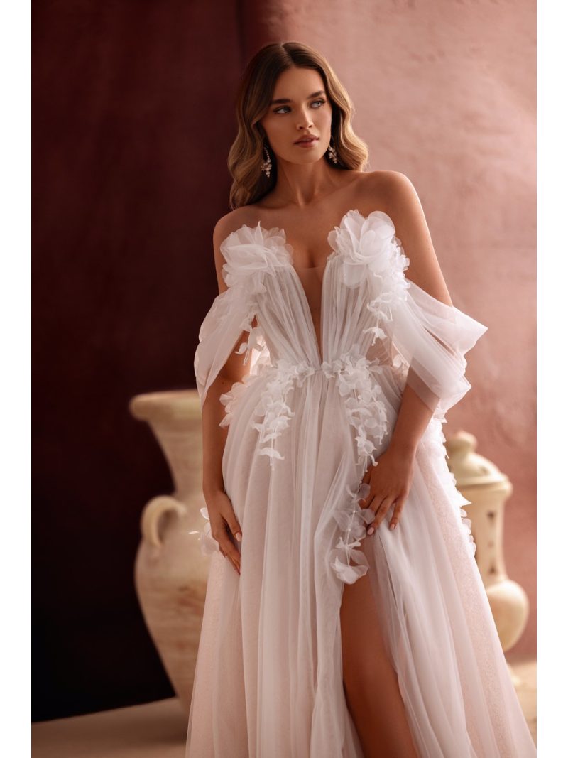 Το Bella είναι ένα νυφικό που γιορτάζει τη θηλυκότητα με ένα τολμηρό και ονειρικό πνεύμα. Το σχέδιο με τους έξω ώμους και το βαθύ ντεκολτέ δημιουργούν ένα σαγηνευτικό σχήμα, ενώ οι αέρινες στρώσεις από τούλι ρέουν σε κάθε βήμα, δίνοντας στο φόρεμα μια αίσθηση ανάλαφρης υφής. Οι φλοράλ πινελιές που τοποθετούνται κατά μήκος του μπούστου και των μανικιών προσθέτουν υφή και ρομαντισμό, φέρνοντας μια απαλή, γλυπτική πινελιά. Ένα ψηλό σκίσιμο ολοκληρώνει την εμφάνιση, συνδυάζοντας τον αισθησιασμό με την ελευθερία κινήσεων. Το Bella είναι για νύφες που θέλουν να νιώσουν αξέχαστες και ελεύθερες, κάνοντας την ημέρα του γάμου τους όχι μόνο όμορφη αλλά πραγματικά δική τους.