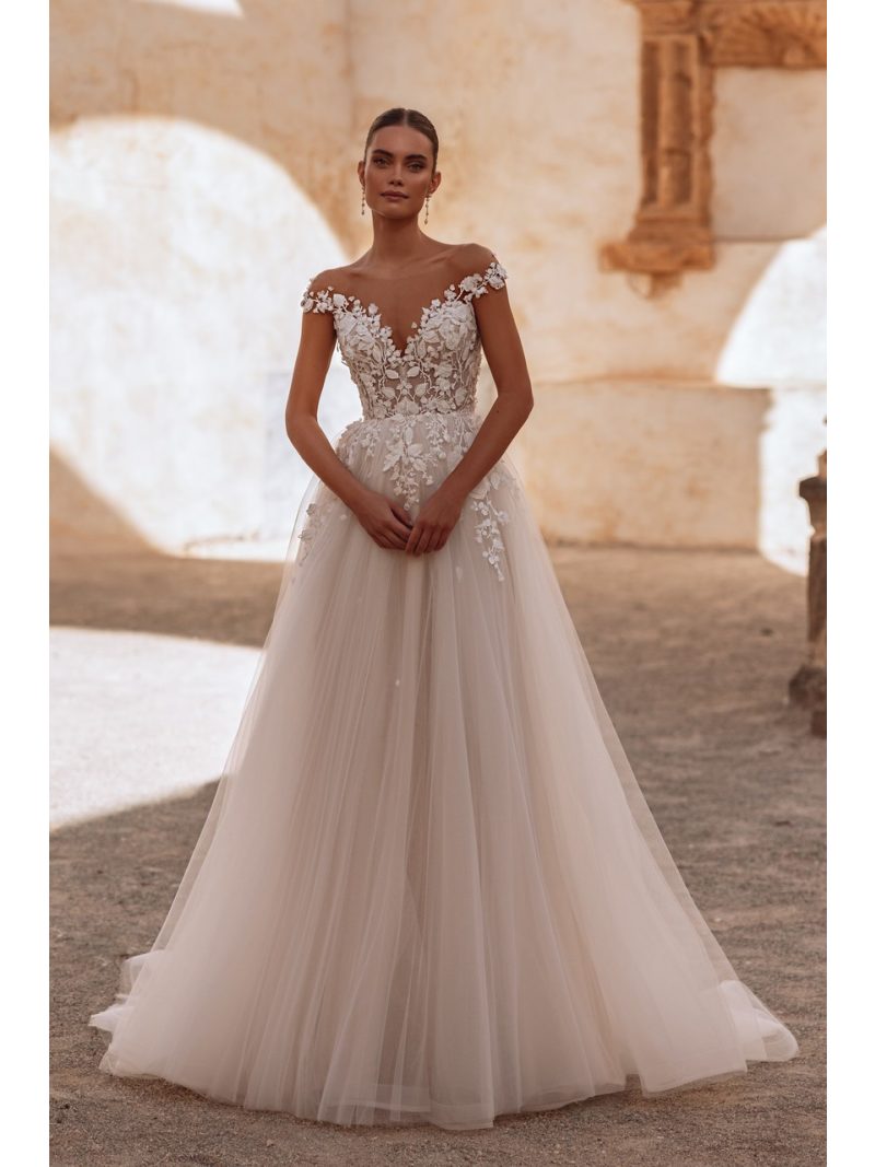Το Armori είναι ένα φόρεμα σχεδιασμένο για νύφες που θέλουν μια εμφάνιση ρομαντική, εκλεπτυσμένη και αβίαστα θηλυκή. Η βαθιά λαιμόκοψη σε σχήμα V διαμορφώνει όμορφα τη σιλουέτα, ενώ το εφαρμοστό μπούστο με απλικέ από φλοράλ δαντέλα τραβάει την προσοχή με τις λεπτές λεπτομέρειες. Τα διάφανα μακριά μανίκια προσφέρουν μια αίσθηση ελαφριάς κάλυψης, ολοκληρώνονται με ασορτί δαντέλα που συνδυάζεται άψογα με το σχέδιο. Η ρέουσα φούστα από τούλι δημιουργεί απαλή κίνηση, δίνοντας στο φόρεμα έναν ανάλαφρο και χαριτωμένο χαρακτήρα που είναι εντυπωσιακός χωρίς να είναι υπερβολικός. Αυτό είναι ένα φόρεμα για γυναίκες που θέλουν να αισθάνονται σίγουρες, χαριτωμένες και πραγματικά αξέχαστες την ημέρα του γάμου τους - ένα σχέδιο που εξισορροπεί την απαλότητα με τη δύναμη σε κάθε λεπτομέρεια.