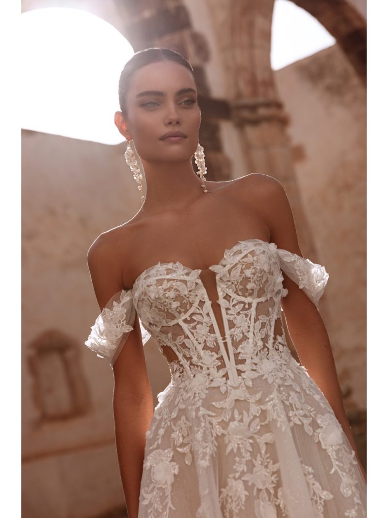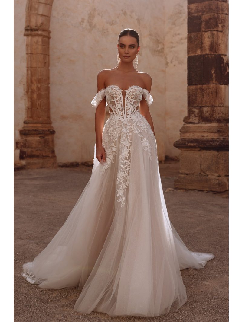 Το Ariella είναι ένα νυφικό σχεδιασμένο για νύφες που θέλουν να συνδυάσουν την κομψότητα με τον μοντέρνο ρομαντισμό. Ο δομημένος κορσές με το εμφανές τελείωμα σμιλεύει τη σιλουέτα και ορίζει τη μέση, ενώ τα απαλά μανίκια με ανοιχτούς ώμους προσδίδουν μια πινελιά αβίαστης θηλυκότητας. Το φόρεμα ρέει μέσα σε μια ελαφριά φούστα σε γραμμή Α από αέρινο τούλι, κινούμενο όμορφα με κάθε βήμα και δημιουργώντας μια κομψή αλλά φυσική εμφάνιση. Οι δαντελένιες απλικέ που τοποθετούνται στο μπούστο και καταλήγουν στη φούστα προσθέτουν φινέτσα και βάθος, κάνοντας το φόρεμα εντυπωσιακό από κάθε γωνία. Αυτό το φόρεμα δημιουργήθηκε για νύφες που θέλουν να αισθάνονται σίγουρες και λαμπερές, διατηρώντας παράλληλα το στυλ τους διαχρονικό. Είναι ταυτόχρονα ντελικάτο και δυναμικό - μια τέλεια επιλογή για μια γυναίκα που θέλει η ημέρα του γάμου της να αντικατοπτρίζει την προσωπικότητά της όσο και την ομορφιά της.