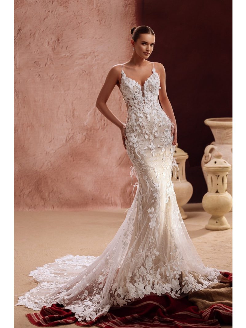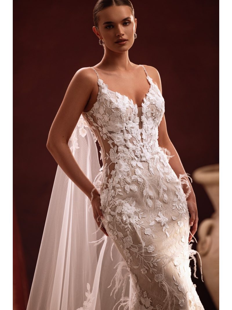 Το Aspasia είναι ένα νυφικό σχεδιασμένο για νύφες που θέλουν μια εμφάνιση εντυπωσιακή, θηλυκή και αξέχαστη. Η σιλουέτα της γοργόνας που αγκαλιάζει το σώμα αναδεικνύει τις φυσικές καμπύλες, ενώ οι λεπτές φλοράλ δαντελένιες απλικέ ρέουν άψογα από το μπούστο μέχρι την εντυπωσιακή ουρά. Οι λεπτές τιράντες και το σμιλεμένο ντεκολτέ πλαισιώνουν όμορφα τους ώμους, ενώ οι πλαϊνές λεπτομέρειες με την ψευδαίσθηση προσδίδουν ακριβώς τη σωστή δόση γοητείας. Η μακριά δαντελένια ουρά ολοκληρώνει το σχέδιο, διασφαλίζοντας ότι κάθε βήμα αφήνει μια διαρκή εντύπωση. Αυτό το νυφικό δημιουργήθηκε για γυναίκες που εκτιμούν την ομορφιά με την αυτοπεποίθηση - ένα σχέδιο που συνδυάζει τον ρομαντισμό, τη δύναμη και την ατομικότητα σε τέλεια αρμονία.