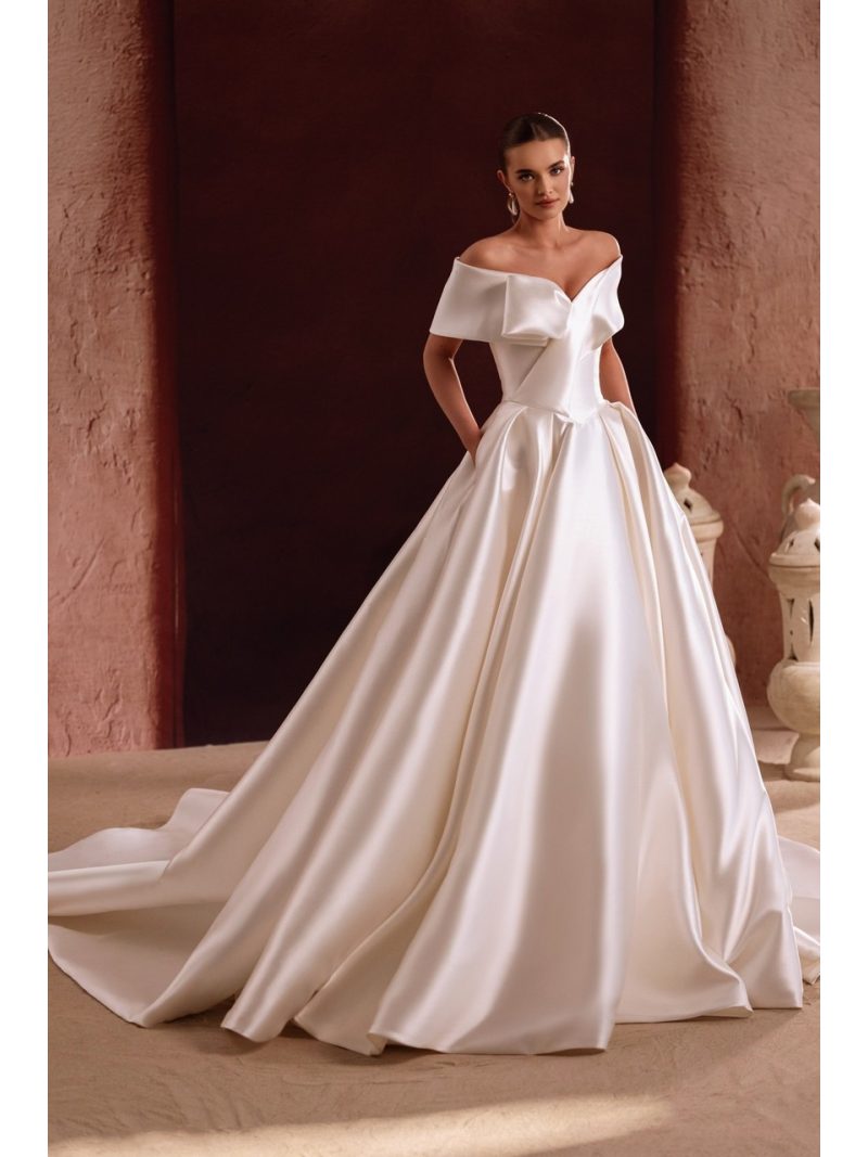 Το Avin είναι ένα φόρεμα σχεδιασμένο για νύφες που θέλουν να συνδυάσουν την κλασική κομψότητα με μια μοντέρνα πινελιά. Το ντεκολτέ με τους ώμους πλαισιώνει όμορφα τους ώμους, ενώ το δομημένο μπούστο αναδεικνύει τη μέση και δημιουργεί μια εκλεπτυσμένη σιλουέτα. Οι φαρδιές σατέν πτυχώσεις προσθέτουν βάθος και κομψότητα, και η πλήρης φούστα ρέει σε μια φαρδιά ουρά που ολοκληρώνεται με μια λεπτή σειρά από καλυμμένα κουμπιά στην πλάτη. Κάθε στοιχείο έχει κατασκευαστεί για να δώσει στο φόρεμα μια βασιλική αλλά και αβίαστη παρουσία, καθιστώντας το ιδανική επιλογή για νύφες που ονειρεύονται μια μεγαλοπρεπή είσοδο. Αυτό το φόρεμα δημιουργήθηκε για γυναίκες που θέλουν να αισθάνονται χαριτωμένες, σίγουρες και αξέχαστες την ημέρα του γάμου τους - ένα διαχρονικό σχέδιο ερμηνευμένο με μια φρέσκια, σύγχρονη στάση.