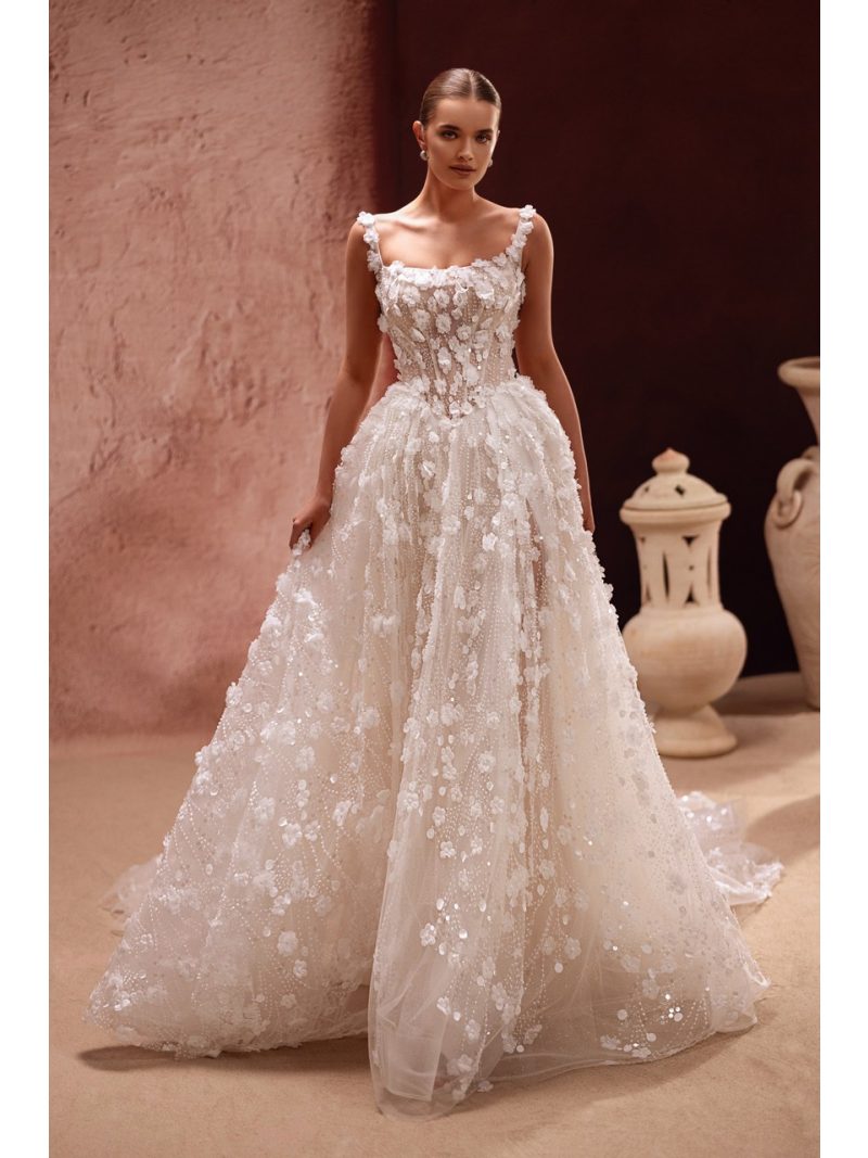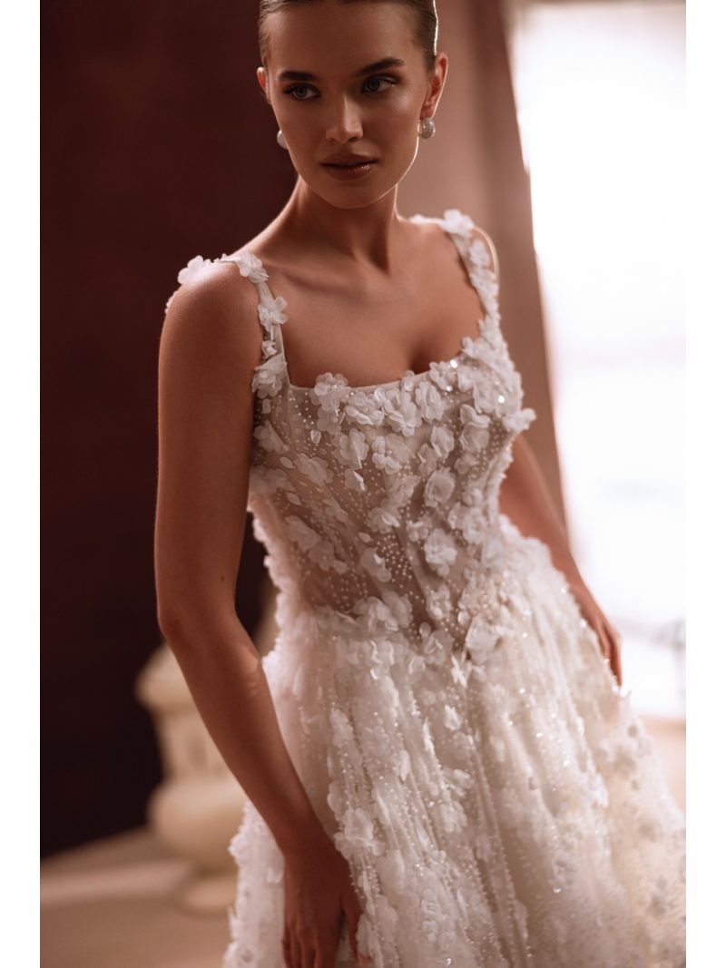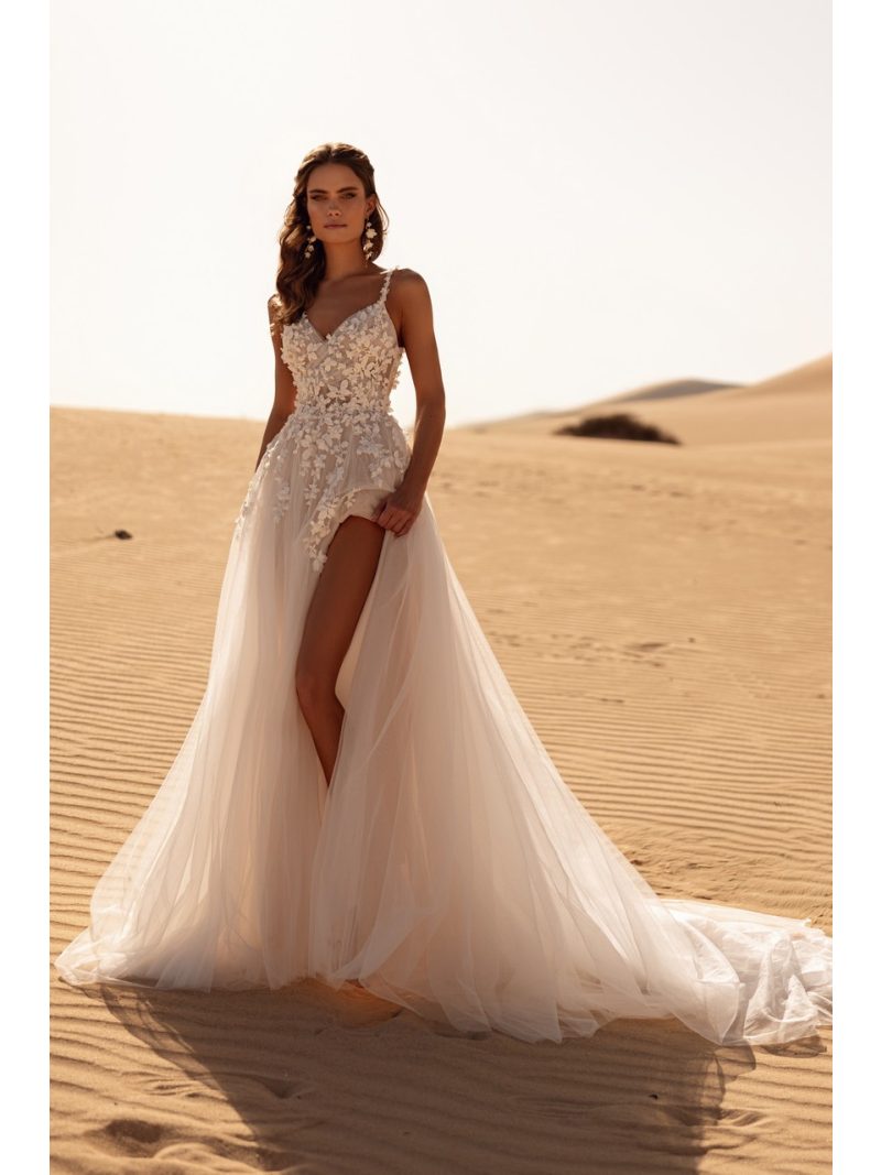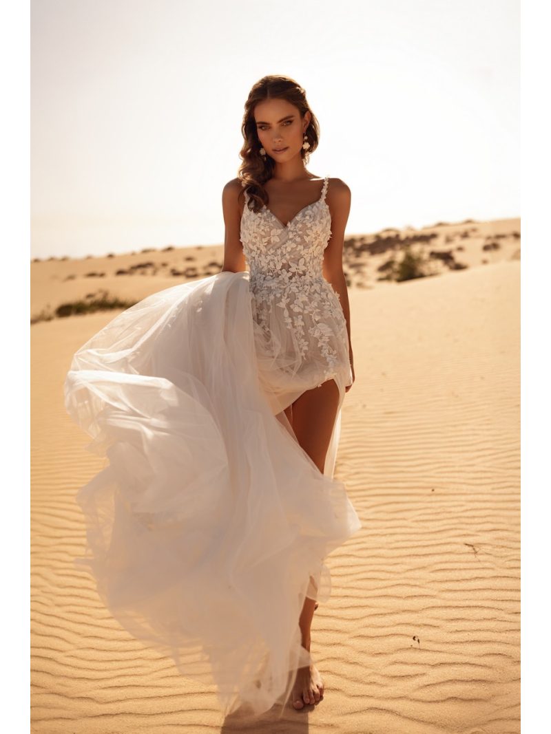 Το Aviva είναι ένα φόρεμα σχεδιασμένο για νύφες που επιθυμούν ρομαντισμό με μια τολμηρή πινελιά. Το μπούστο, πλούσια διακοσμημένο με φλοράλ απλικέ, δημιουργεί μια εντυπωσιακή αντίθεση με την αέρινη φούστα από τούλι που κινείται αβίαστα με κάθε βήμα. Η εφαρμοστή γραμμή στη μέση αναδεικνύει τη σιλουέτα, ενώ το ψηλό σκίσιμο προσθέτει ανάλαφρη αίσθηση και μια παιχνιδιάρικη νότα, ιδανική για νύφες που θέλουν τόσο χάρη όσο και αυτοπεποίθηση την ημέρα του γάμου τους. Αυτό το φόρεμα είναι ονειρικό αλλά και τολμηρό, ένας συνδυασμός που το κάνει αξέχαστο από την τελετή μέχρι την πίστα.