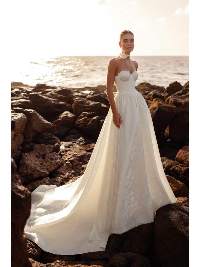 Το Amira είναι ένα φόρεμα για νύφες που θέλουν να λάμπουν με αυτοπεποίθηση από την πρώτη κιόλας στιγμή. Το μπούστο χωρίς τιράντες από κορσέ, σμιλεμένο με καθαρές γραμμές, αναδεικνύει τους ώμους και την κλείδα για μια κομψή, μοντέρνα εμφάνιση. Καλυμμένο εξ ολοκλήρου με ντελικάτα, λαμπερά διακοσμητικά, το φόρεμα παγιδεύει το φως όμορφα, δημιουργώντας μια απαλή λάμψη σε κάθε βήμα. Η πλήρης φούστα ρέει αβίαστα, δίνοντας στη σιλουέτα δομή και κίνηση, έτσι ώστε η νύφη να αισθάνεται χαριτωμένη και λαμπερή όλη την ημέρα. Αυτό είναι ένα φόρεμα σχεδιασμένο για γυναίκες που θέλουν μια διαχρονική νυφική εμφάνιση με μια σύγχρονη πινελιά - λαμπερή, αβίαστη και αξέχαστη.