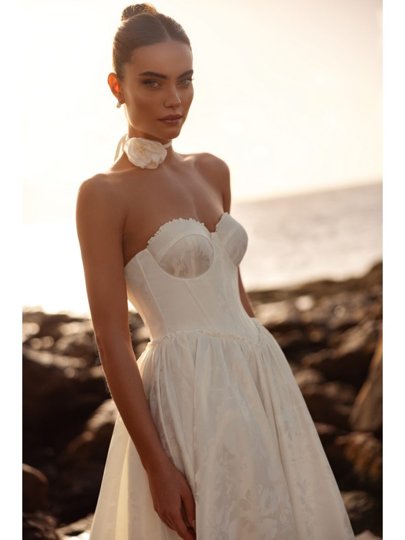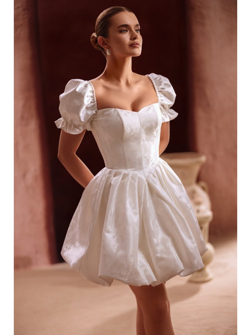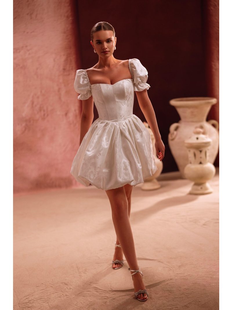 Το Daphne είναι μια τολμηρή και παιχνιδιάρικη επιλογή για νύφες που θέλουν κάτι πραγματικά απροσδόκητο. Με την κοντή φούστα σε στυλ μπαλονιού και το καμπυλωτό μπούστο από κορσέ, αυτό το νυφικό συνδυάζει την κλασική νυφική δεξιοτεχνία με μια φρέσκια, νεανική ατμόσφαιρα. Η λαιμόκοψη σε σχήμα καρδιάς αναδεικνύει την κλείδα, ενώ τα φουσκωτά μανίκια προσδίδουν μια πινελιά δράματος και ρομαντισμού. Φτιαγμένο από ύφασμα ζακάρ με διακριτική λάμψη, το Daphne είναι ταυτόχρονα πολυτελές και διασκεδαστικό, καθιστώντας το ιδανικό για μια τελετή στην πόλη, μια εμφάνιση μετά το πάρτι ή για μια νύφη που θέλει να ξεφύγει από την παράδοση χωρίς να χάσει τη νυφική της γοητεία.