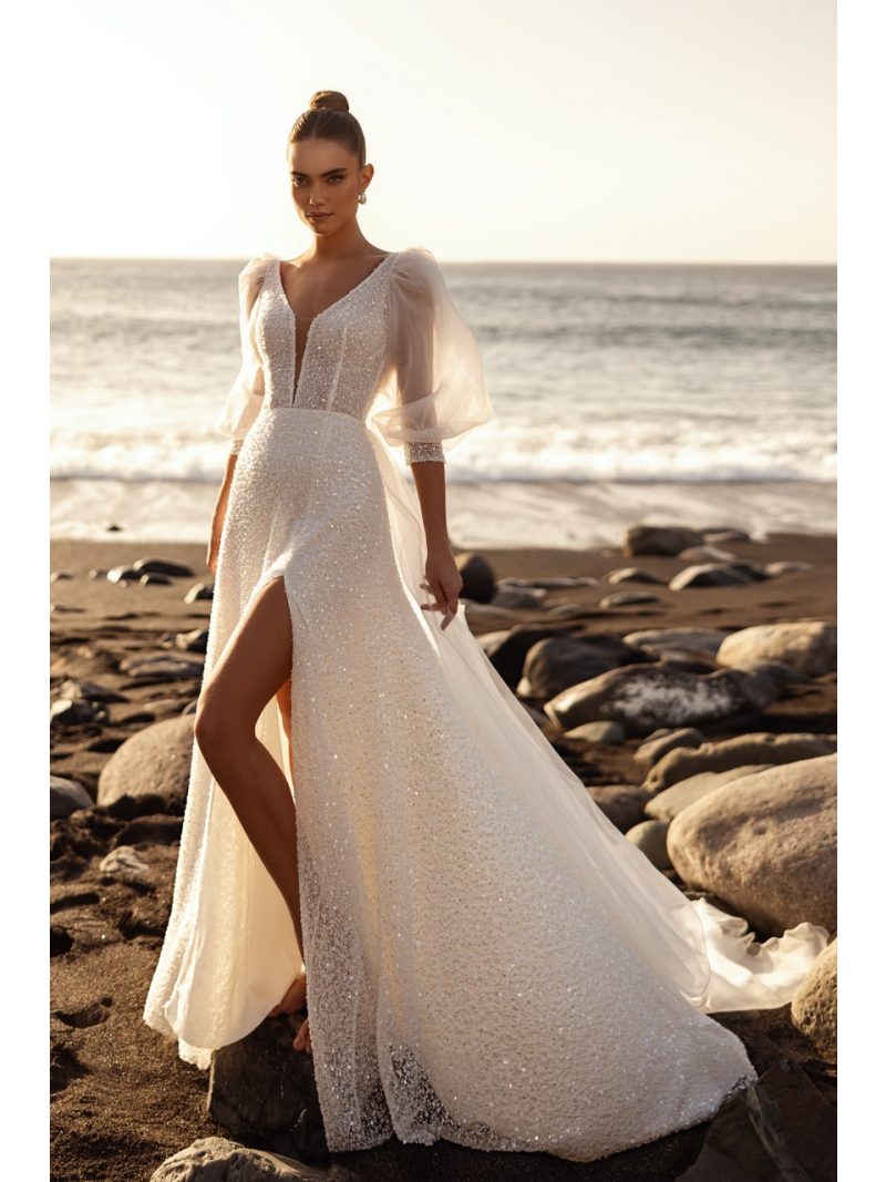 Το Davina είναι ένα φόρεμα που δημιουργήθηκε για νύφες που θέλουν να νιώθουν λαμπερή και γεμάτη αυτοπεποίθηση. Σχεδιασμένο με λαμπερό ύφασμα που παγιδεύει το φως όμορφα, δίνει σε κάθε κίνηση μια απαλή λάμψη. Η λαιμόκοψη σε σχήμα V και το δομημένο μπούστο δημιουργούν μια κολακευτική γραμμή, ενώ τα αέρινα, φουσκωτά μανίκια προσθέτουν μια πινελιά ρομαντισμού χωρίς να μειώνουν την άνεση. Το ψηλό σκίσιμο στη φούστα φέρνει μια αίσθηση ελευθερίας και προσωπικότητας, ιδανικό για νύφες που θέλουν ένα φόρεμα που να είναι φρέσκο και δυναμικό. Η ρέουσα ουρά κάνει μια δήλωση καθώς σέρνεται πίσω, ολοκληρώνοντας την ισορροπία μεταξύ γοητείας και αυτοπεποίθησης. Αυτό το φόρεμα είναι ιδανικό για γάμους όπου η κομψότητα συναντά την ατομικότητα.