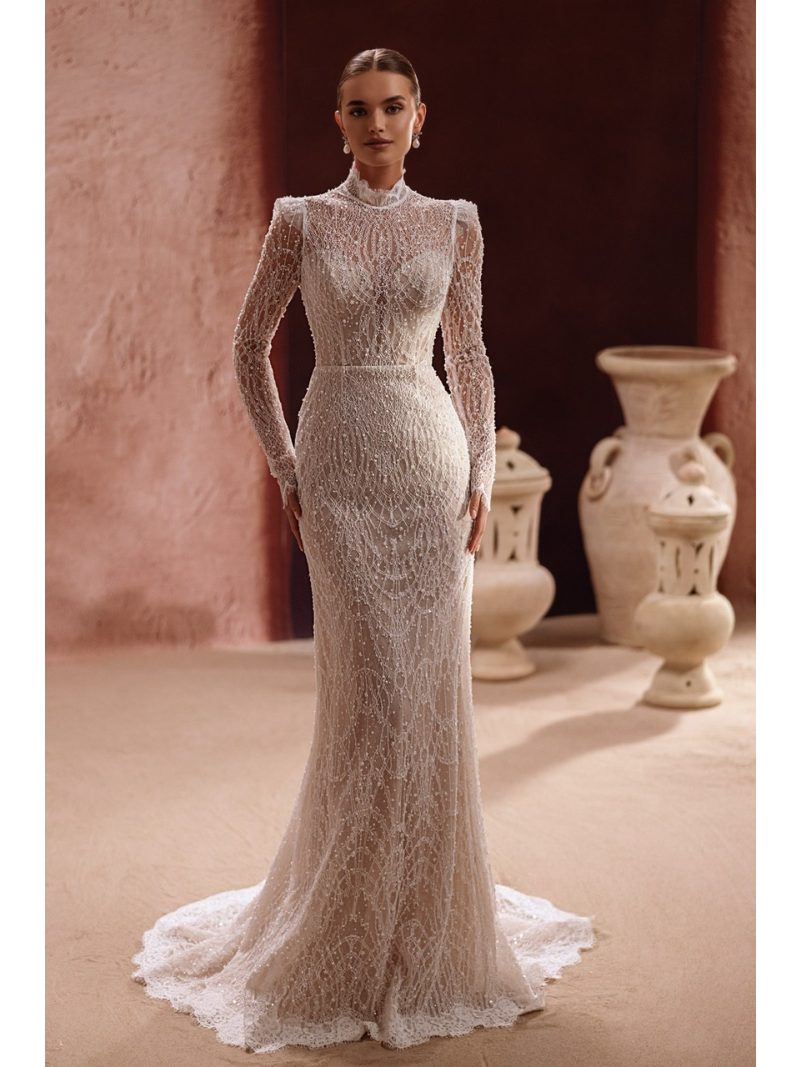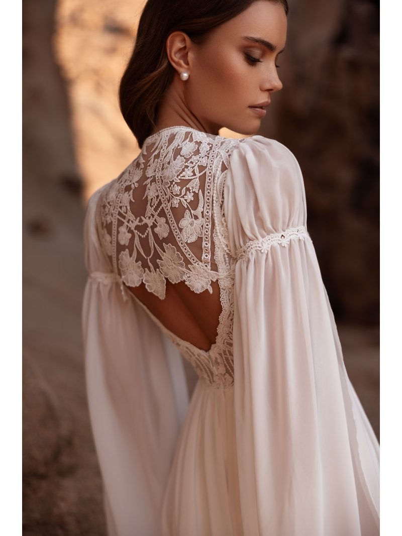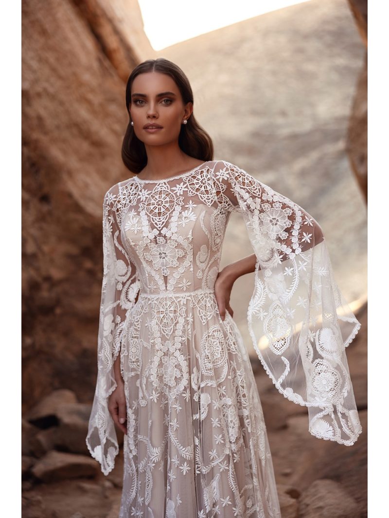 Το Dune είναι ένα νυφικό που απευθύνεται σε νύφες που ονειρεύονται να κάνουν μια δήλωση χωρίς να πουν λέξη. Το φόρεμα χαρακτηρίζεται από την περίτεχνη δαντέλα του, όπου κάθε μοτίβο είναι προσεκτικά τοποθετημένο για να δημιουργήσει βάθος και διάσταση. Τα διάφανα μακριά μανίκια με τις μακριές μανσέτες δίνουν στο φόρεμα μια αίσθηση ελευθερίας και καλλιτεχνίας, ενώ το εφαρμοστό μπούστο αναδεικνύει τη μέση πριν μετατραπεί σε μια μακριά φούστα με μια εντυπωσιακή ουρά. Από κάθε γωνία, το φόρεμα μοιάζει με αριστούργημα — συνδυάζοντας το μποέμικο πνεύμα με την αναμφισβήτητη κομψότητα.