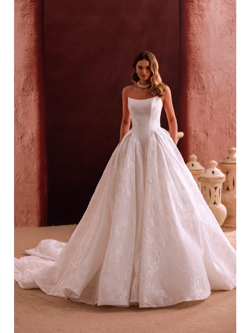 Το φόρεμα Hebe είναι ένα εντυπωσιακό κομμάτι για νύφες που ονειρεύονται μια πραγματικά αξέχαστη είσοδο. Το στράπλες μπούστο του είναι λιτό και δομημένο, αναδεικνύοντας το ντεκολτέ, διατηρώντας παράλληλα την έμφαση στη εντυπωσιακή φούστα. Κατασκευασμένο από πλούσιο ζακάρ ύφασμα, η σιλουέτα του φορέματος ρέει σε μια φαρδιά ουρά, δημιουργώντας μια αίσθηση μεγαλοπρέπειας σε κάθε βήμα. Η υφή του υφάσματος προσθέτει βάθος και διάσταση, αποδεικνύοντας ότι το διαχρονικό σχέδιο μπορεί να είναι δυναμικό και φρέσκο ταυτόχρονα.