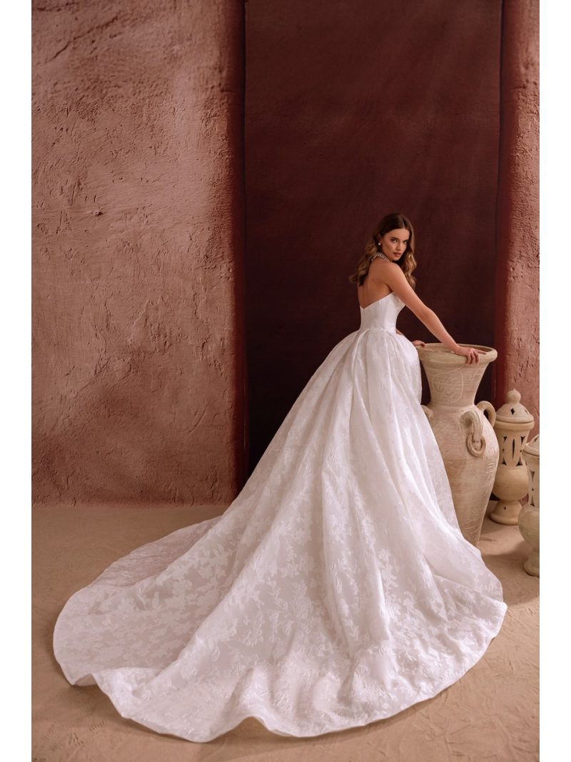 Το Becco είναι ένα φόρεμα που δημιουργήθηκε για νύφες που εκτιμούν τη λεπτομέρεια όσο και την παρουσία. Το δομημένο μπούστο με τις φαρδιές τιράντες πλαισιώνει όμορφα το ντεκολτέ, ενώ το σχέδιο δαντέλας σε όλη την επιφάνεια δίνει στο φόρεμα ένα πλούσιο, ανάγλυφο φινίρισμα. Ρέοντας μέσα σε μια φαρδιά φούστα και μια φαρδιά ουρά, το φόρεμα κινείται με χάρη και δημιουργεί μια εντυπωσιακή εντύπωση από κάθε γωνία. Αυτό το φόρεμα συνδυάζει τον ρομαντισμό με τη δύναμη - ιδανικό για νύφες που θέλουν η εμφάνισή τους να είναι διαχρονική αλλά και πραγματικά προσωπική.