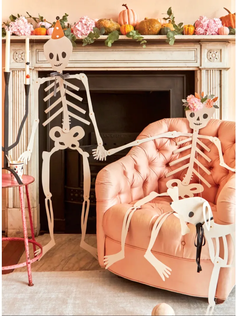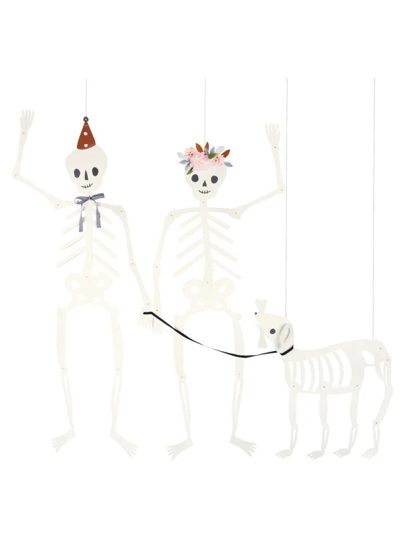 Ένας από τους σκελετούς έχει ένα καπέλο πάρτι, ένα ασπρόμαυρο φιόγκο από σατέν κορδέλα