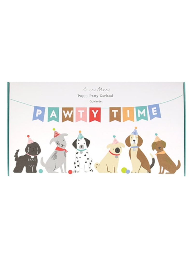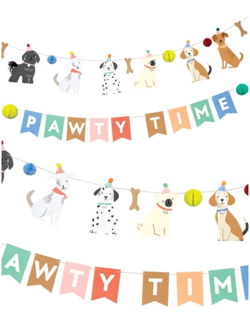 Χάρτινη γιρλάντα με σκύλους σε διάφορα σχέδια και σημαιάκια που αναγράφουν ‘’pawty time’’, περασμένα σε ασορτί κορδόνι.