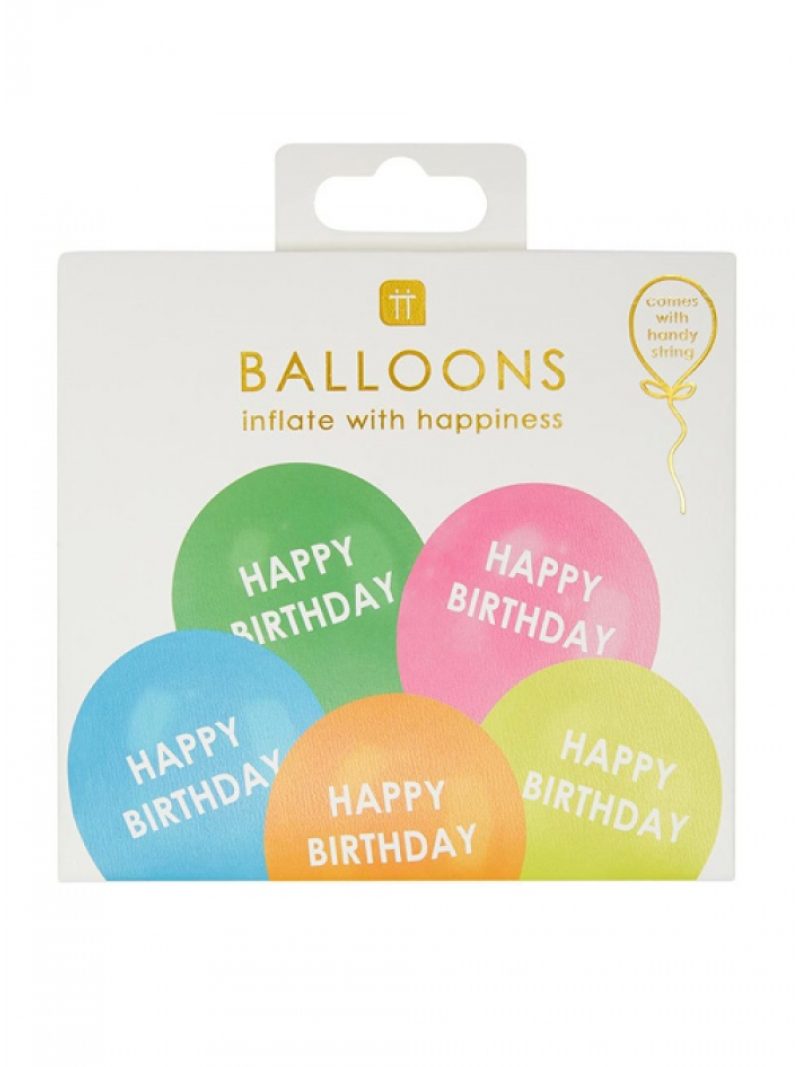 Μπαλόνια απλά, set των 5, σε αποχρώσεις του ουράνιου τόξου που αναγράφουν με λευκά γράμματα Happy Birthday.