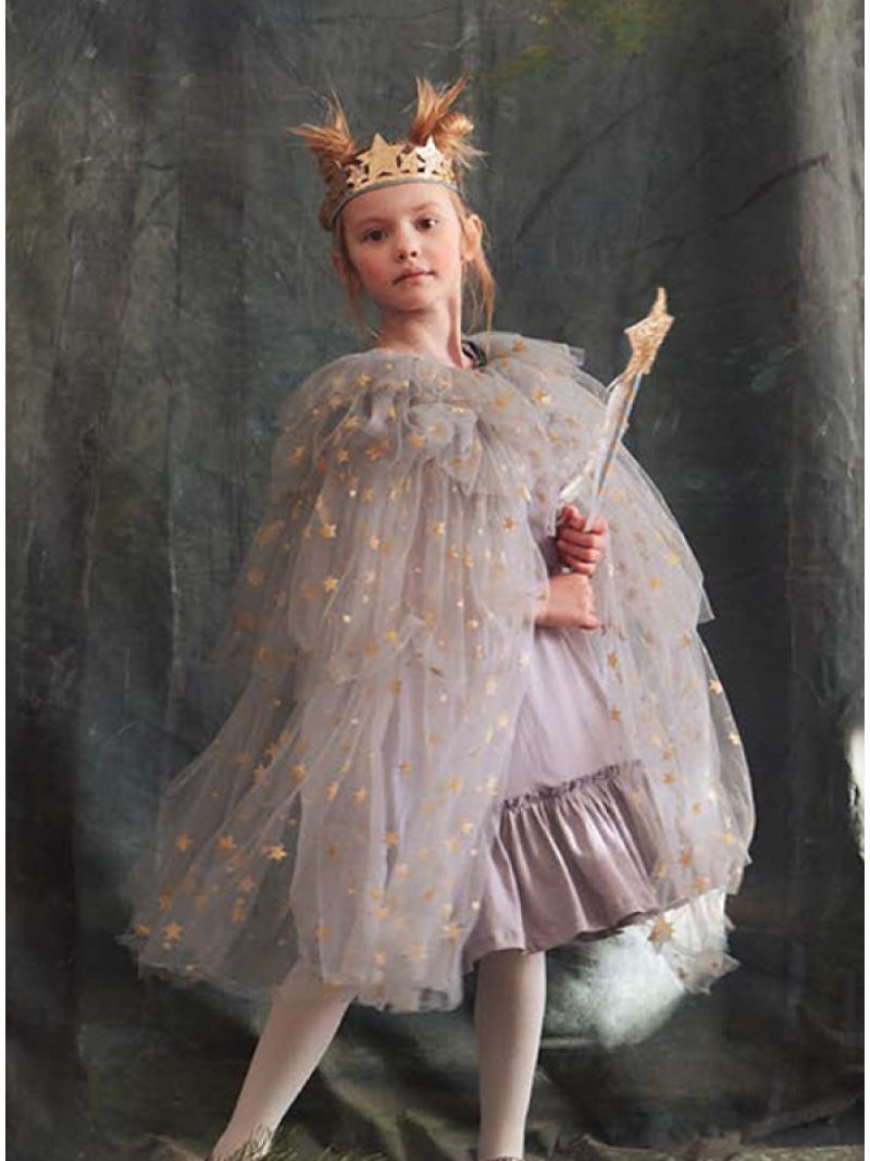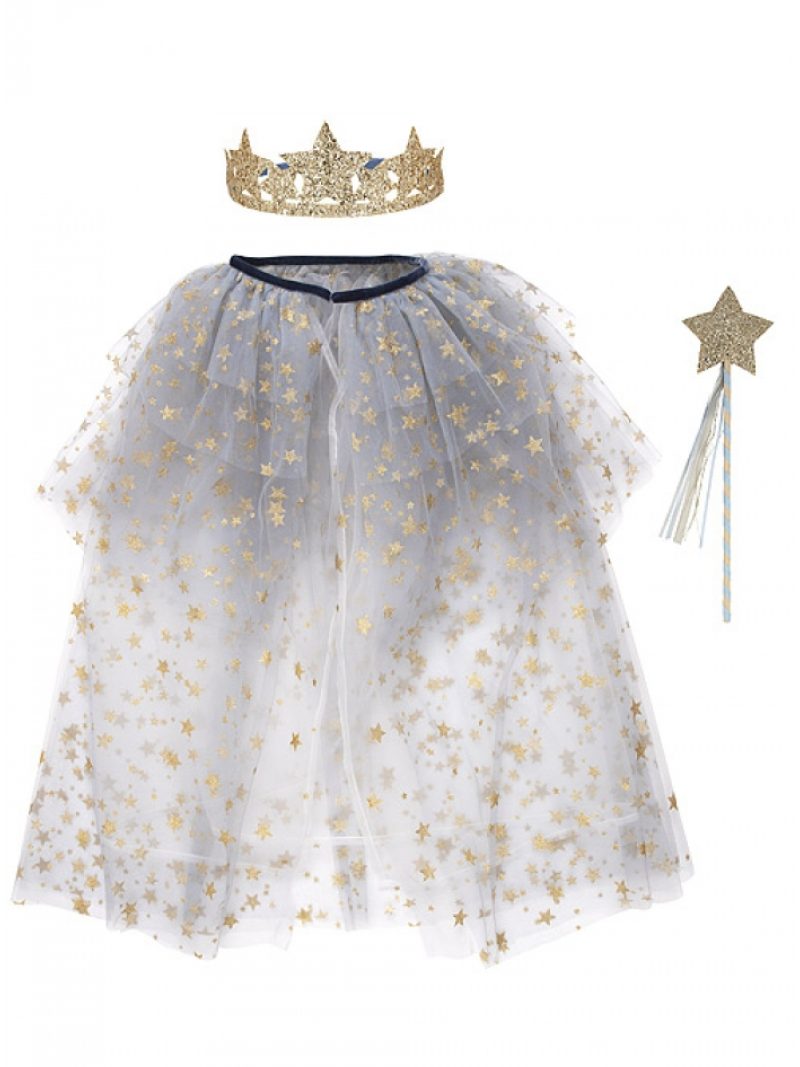 Η κάπα είναι κατασκευασμένη από τούλι σε απαλή μπλε απόχρωση και διακοσμείται με χρυσά αστεράκια.